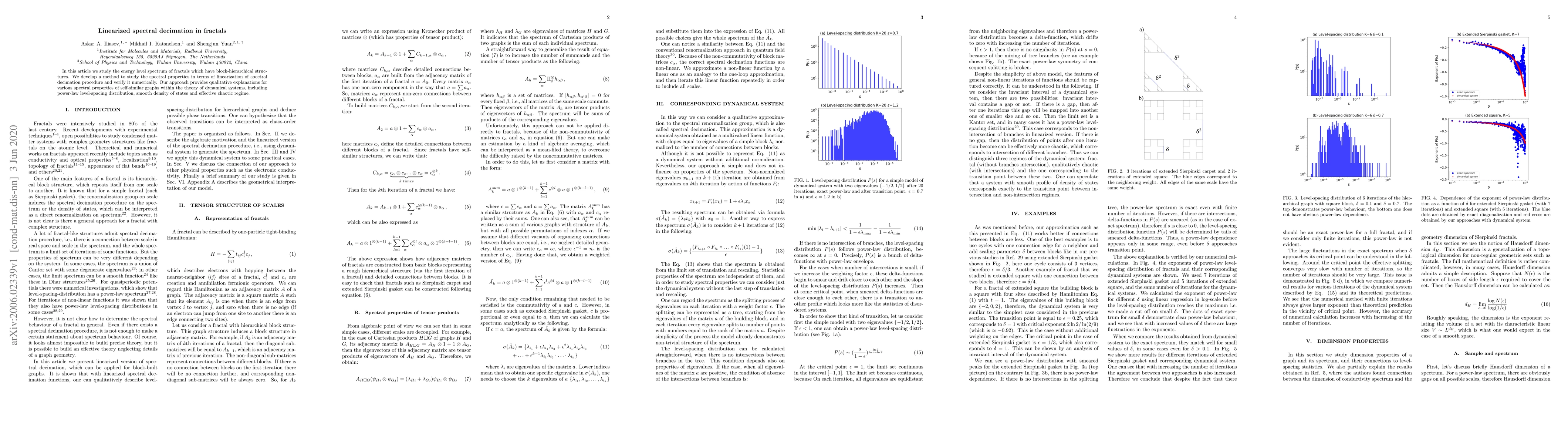 In this article we study the energy level spectrum of fractals which have block-hierarchical structures. We develop a method to study the spectral properties in terms of linearization of spectral decimation procedure and verify it numerically. Our approach provides qualitative explanations for various spectral properties of self-similar graphs within the theory of dynamical systems, including power-law level-spacing distribution, smooth density of states and effective chaotic regime.