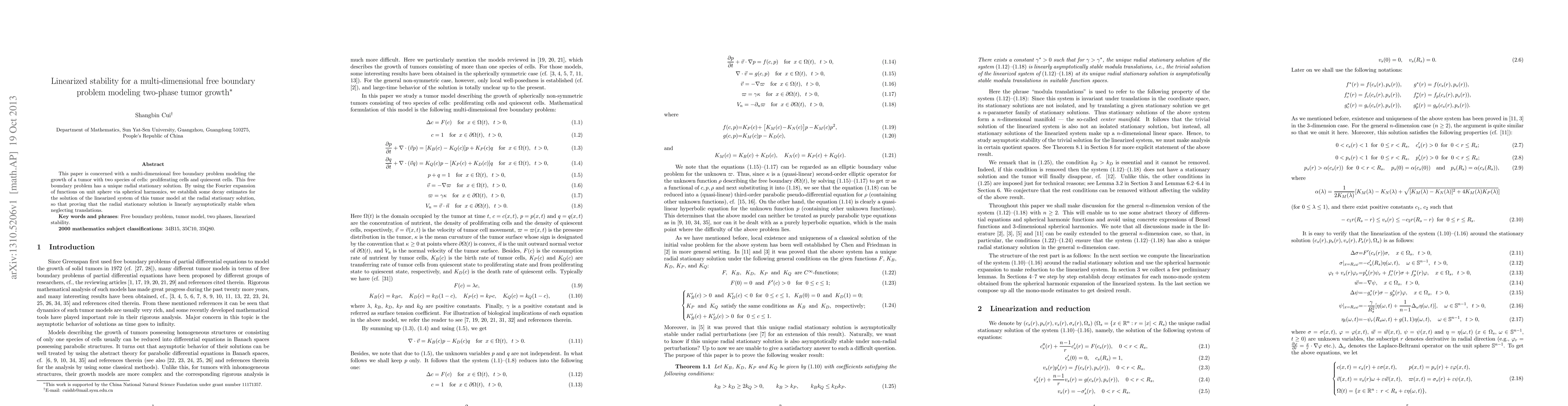 This paper investigates the linearized stability of a multi-dimensional free boundary problem modeling two-phase tumor growth, establishing decay estimates for the linearized system around a radial stationary solution, and proving its linear asymptotic stability when translations are neglected.