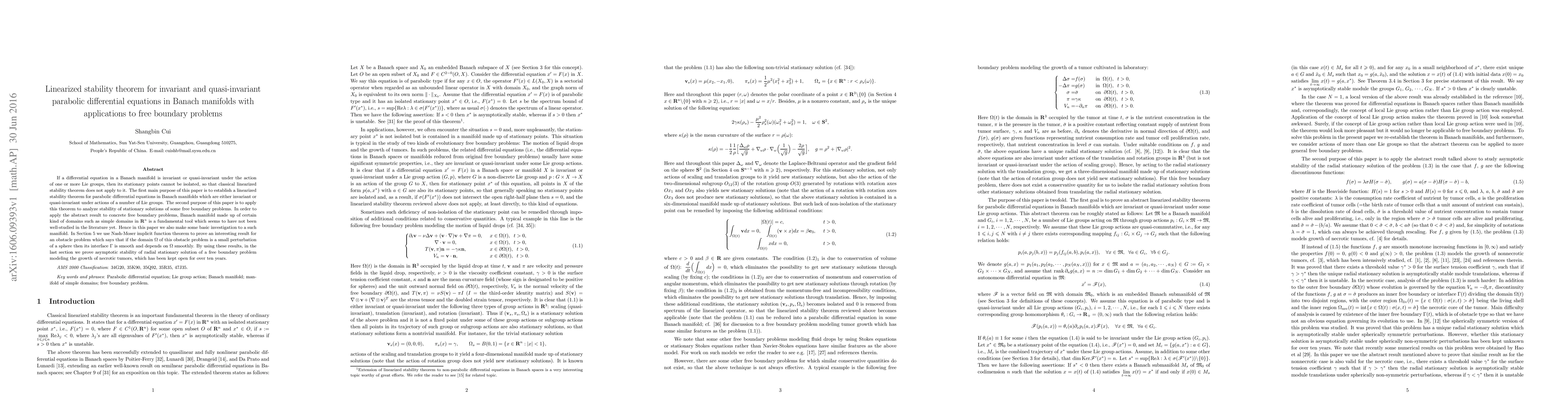 This paper establishes a linearized stability theorem for invariant or quasi-invariant parabolic differential equations in Banach manifolds, extending classical results. It applies this theorem to analyze free boundary problems, proving asymptotic stability for a radial stationary solution in a necrotic tumor growth model.