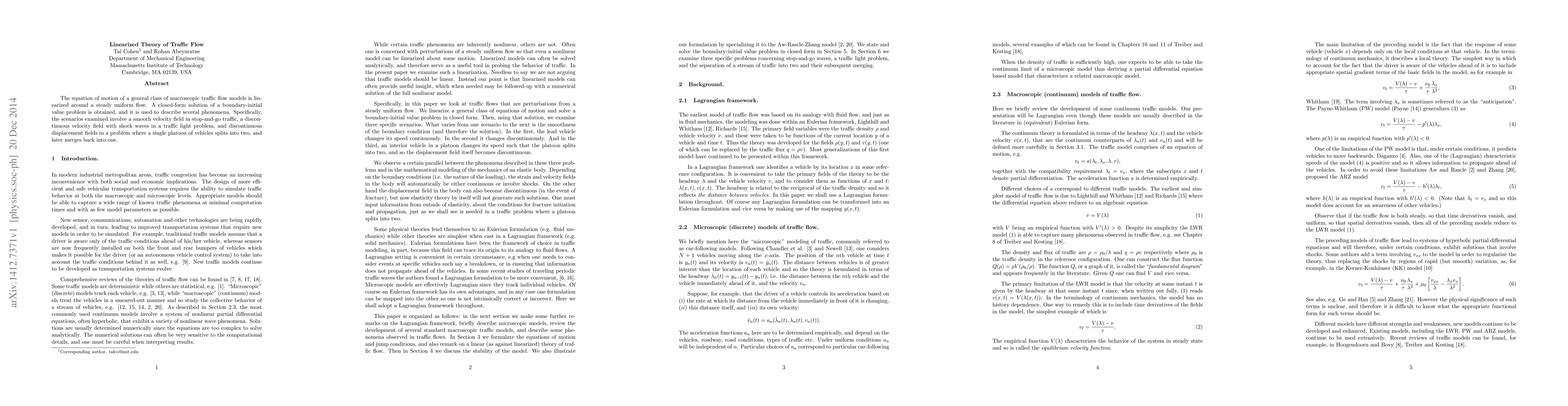 This paper linearizes a general macroscopic traffic flow model around steady uniform flow, deriving a closed-form solution to describe phenomena such as stop-and-go traffic, shock waves from traffic lights, and the splitting and merging of vehicle platoons.