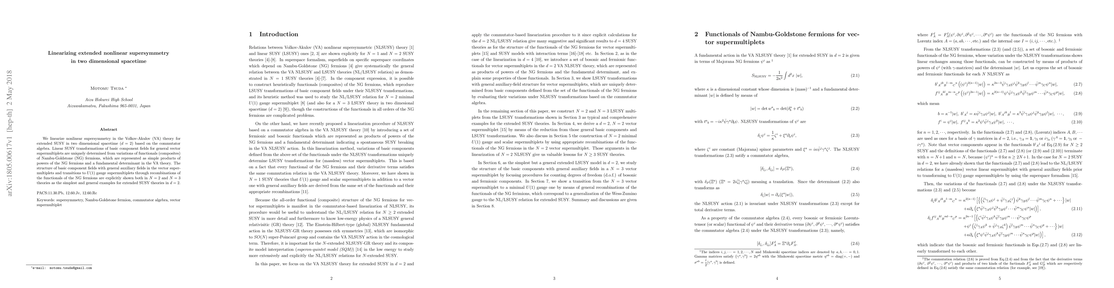 We linearize nonlinear supersymmetry in the Volkov-Akulov (VA) theory for extended SUSY in two dimensional spacetime ($d = 2$) based on the commutator algebra. Linear SUSY transformations of basic component fields for general vector supermultiplets are uniquely determined from variations of functionals (composites) of Nambu-Goldstone (NG) fermions, which are represented as simple products of powers of the NG fermions and a fundamental determinant in the VA theory. The structure of basic component fields with general auxiliary fields in the vector supermultiplets and transitions to $U(1)$ gauge supermultiplets through recombinations of the functionals of the NG fermions are explicitly shown both in $N = 2$ and $N = 3$ theories as the simplest and general examples for extended SUSY theories in $d = 2$.