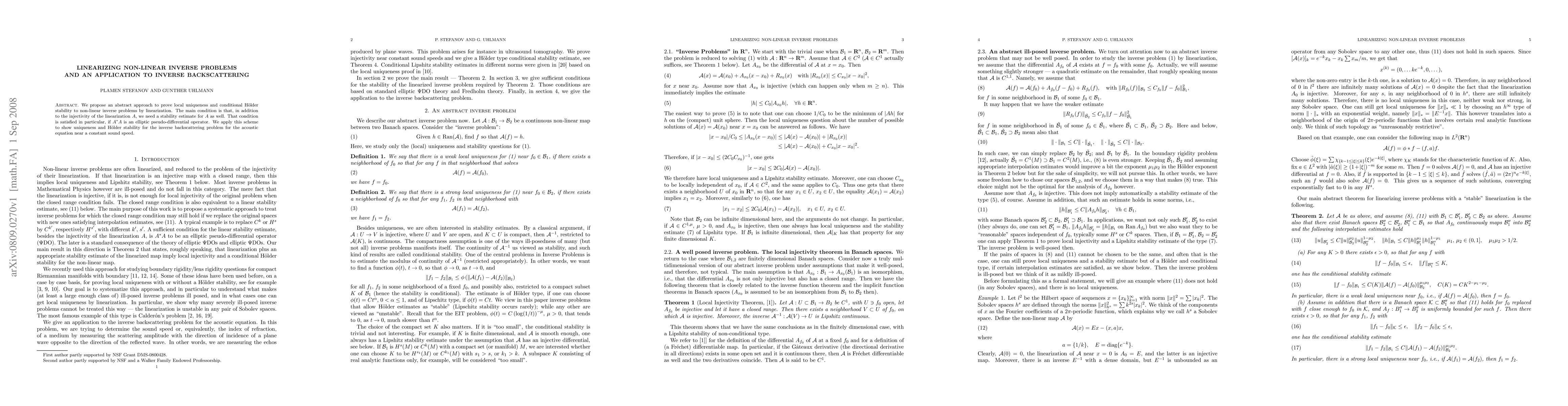 We propose an abstract approach to prove local uniqueness and conditional H\"older stability to non-linear inverse problems by linearization. The main condition is that, in addition to the injectivity of the linearization $A$, we need a stability estimate for $A$ as well. That condition is satisfied in particular, if $A^*A$ is an elliptic pseudo-differential operator. We apply this scheme to show uniqueness and H\"older stability for the inverse backscattering problem for the acoustic equation near a constant sound speed.