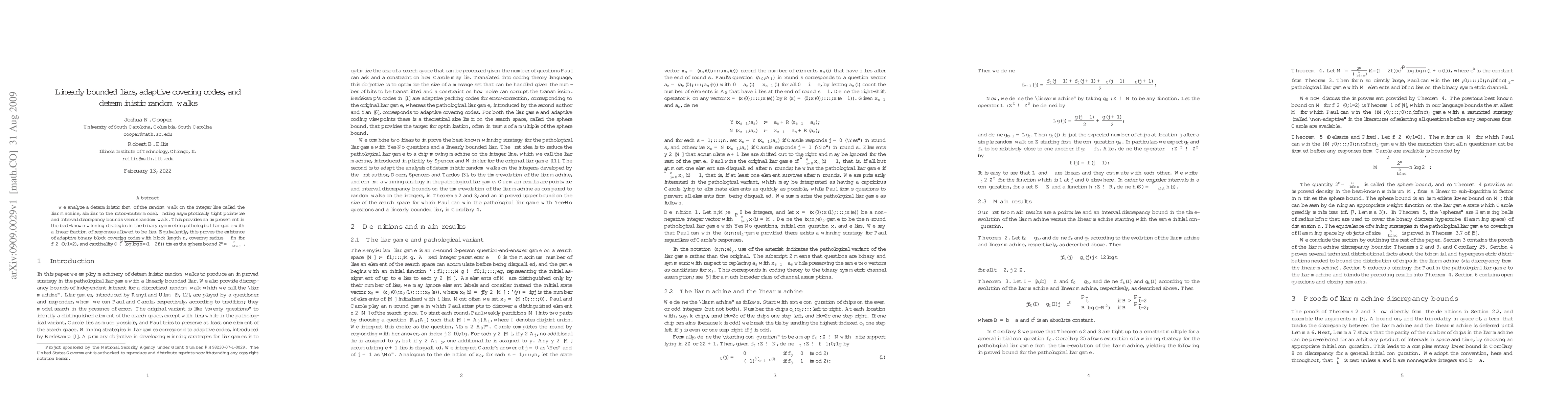 We analyze a deterministic form of the random walk on the integer line called the {\em liar machine}, similar to the rotor-router model, finding asymptotically tight pointwise and interval discrepancy bounds versus random walk. This provides an improvement in the best-known winning strategies in the binary symmetric pathological liar game with a linear fraction of responses allowed to be lies. Equivalently, this proves the existence of adaptive binary block covering codes with block length $n$, covering radius $\leq fn$ for $f\in(0,1/2)$, and cardinality $O(\sqrt{\log \log n}/(1-2f))$ times the sphere bound $2^n/\binom{n}{\leq \lfloor fn\rfloor}$.