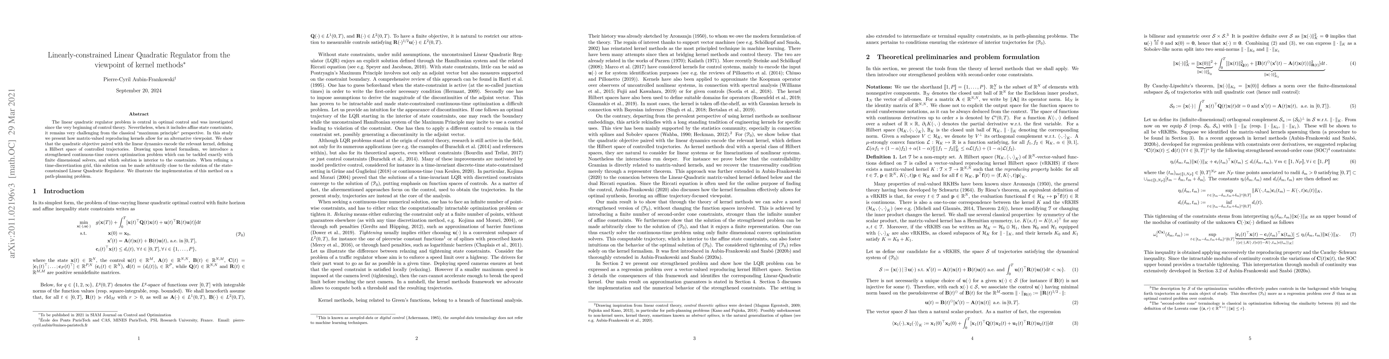 The linear quadratic regulator problem is central in optimal control and was investigated since the very beginning of control theory. Nevertheless, when it includes affine state constraints, it remains very challenging from the classical ``maximum principle`` perspective. In this study we present how matrix-valued reproducing kernels allow for an alternative viewpoint. We show that the quadratic objective paired with the linear dynamics encode the relevant kernel, defining a Hilbert space of controlled trajectories. Drawing upon kernel formalism, we introduce a strengthened continuous-time convex optimization problem which can be tackled exactly with finite dimensional solvers, and which solution is interior to the constraints. When refining a time-discretization grid, this solution can be made arbitrarily close to the solution of the state-constrained Linear Quadratic Regulator. We illustrate the implementation of this method on a path-planning problem.