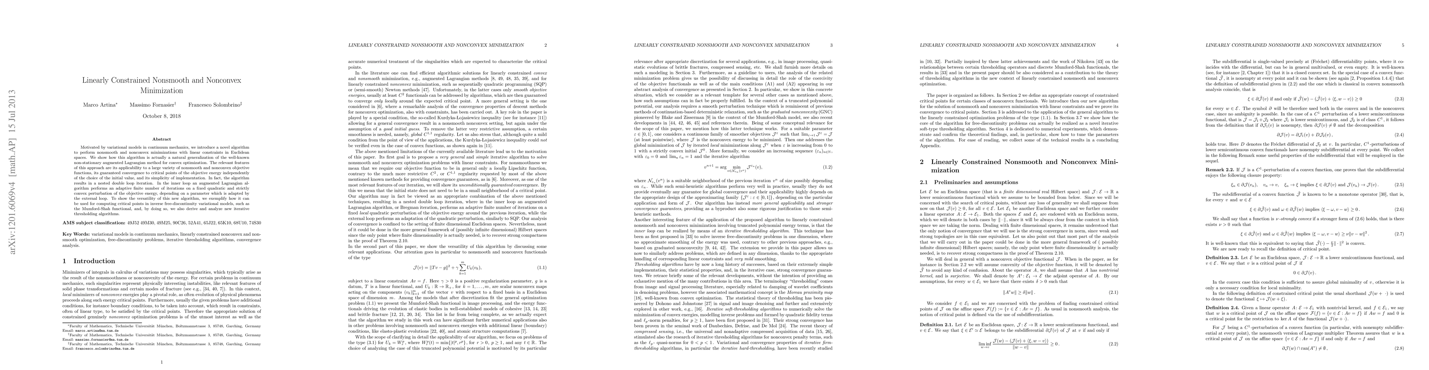 Motivated by variational models in continuum mechanics, we introduce a novel algorithm to perform nonsmooth and nonconvex minimizations with linear constraints in Euclidean spaces. We show how this algorithm is actually a natural generalization of the well-known non-stationary augmented Lagrangian method for convex optimization. The relevant features of this approach are its applicability to a large variety of nonsmooth and nonconvex objective functions, its guaranteed convergence to critical points of the objective energy independently of the choice of the initial value, and its simplicity of implementation. In fact, the algorithm results in a nested double loop iteration. In the inner loop an augmented Lagrangian algorithm performs an adaptive finite number of iterations on a fixed quadratic and strictly convex perturbation of the objective energy, depending on a parameter which is adapted by the external loop. To show the versatility of this new algorithm, we exemplify how it can be used for computing critical points in inverse free-discontinuity variational models, such as the Mumford-Shah functional, and, by doing so, we also derive and analyze new iterative thresholding algorithms.