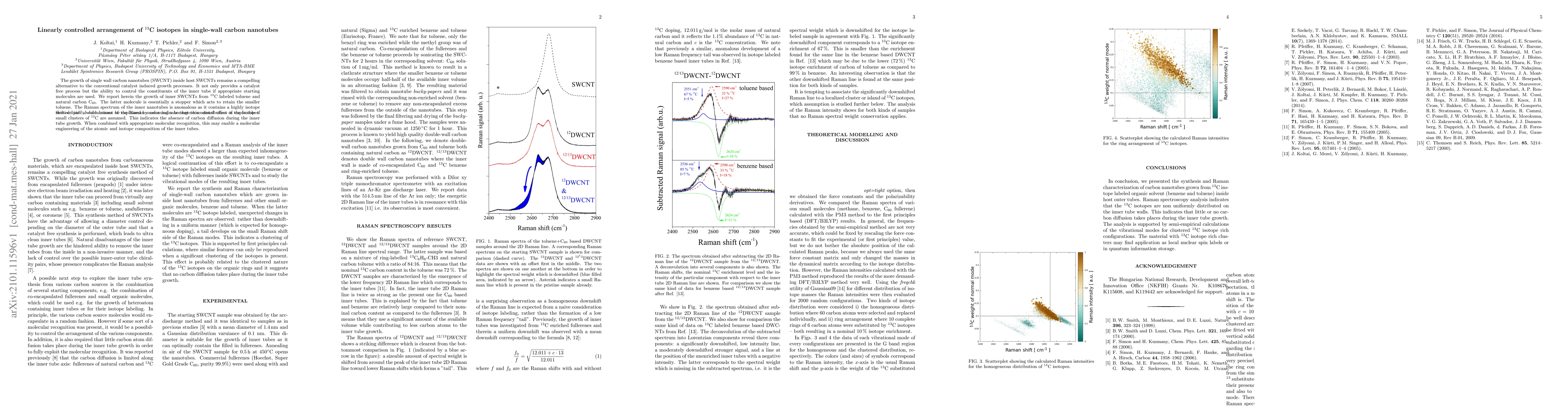 The growth of single wall carbon nanotubes (SWCNT) inside host SWCNTs remains a compelling alternative to the conventional catalyst induced growth processes. It not only provides a catalyst free process but the ability to control the constituents of the inner tube if appropriate starting molecules are used. We report herein the growth of inner SWCNTs from $^{13}$C labeled toluene and natural carbon C$_{60}$. The latter molecule is essentially a stopper which acts to retain the smaller toluene. The Raman spectrum of the inner nanotubes is anomalous as it contains a highly isotope shifted "tail", which cannot be explained by assuming a homogeneous distribution of the isotopes. {\color{black}Semi-empirical} calculations of the Raman modes indicate that this unsual effect is explicable if small clusters of $^{13}$C are assumed. This indicates the absence of carbon diffusion during the inner tube growth. When combined with appropriate molecular recognition, this may enable a molecular engineering of the atomic and isotope composition of the inner tubes.
