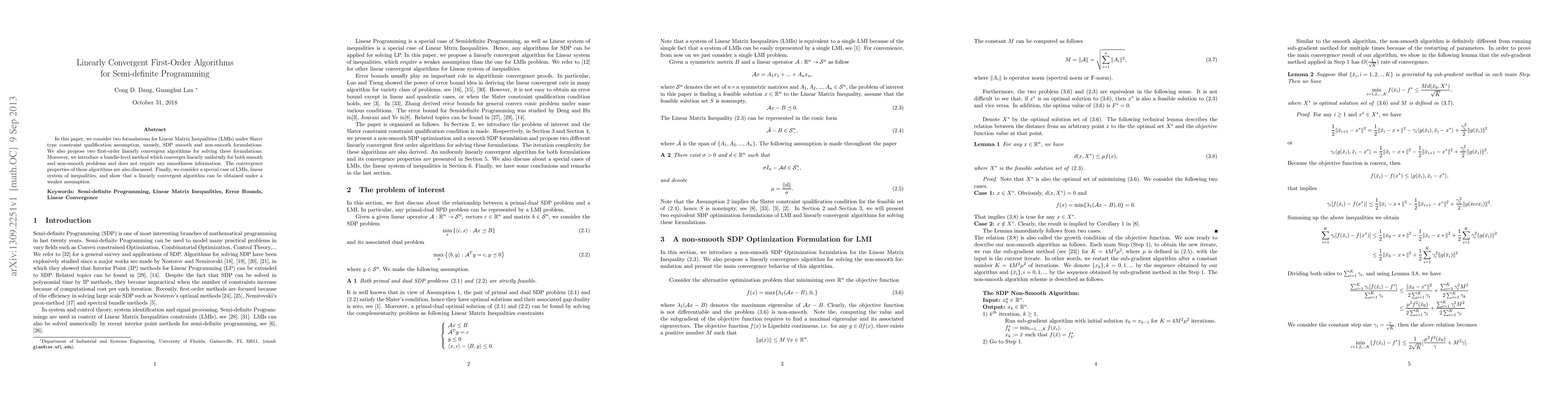 This paper proposes two first-order algorithms for solving smooth and non-smooth semi-definite programming formulations of Linear Matrix Inequalities, demonstrating linear convergence without requiring smoothness information. It also explores a bundle-level method for linear convergence in both cases and examines a special case under weaker assumptions.