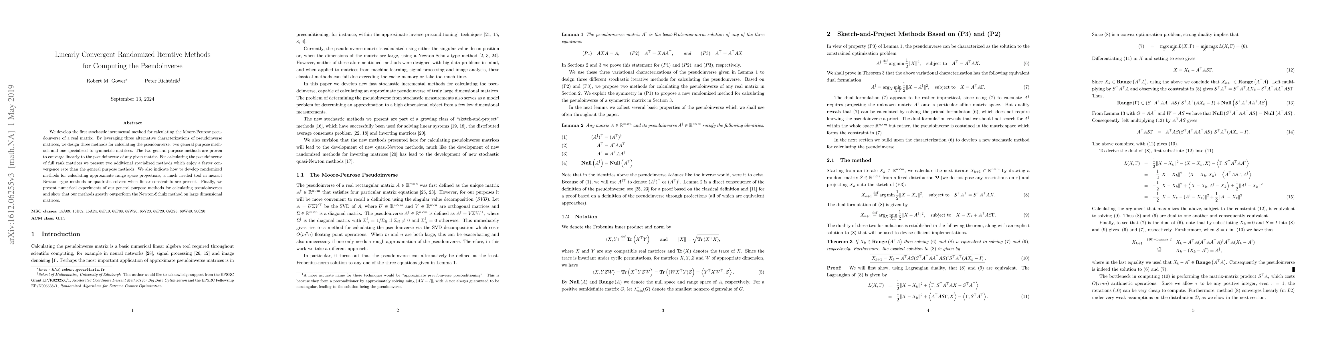This paper introduces stochastic incremental methods for computing the Moore-Penrose pseudoinverse of matrices, proving linear convergence for two general methods and faster convergence for specialized ones. The study also demonstrates superior performance over the Newton-Schulz method for large matrices.