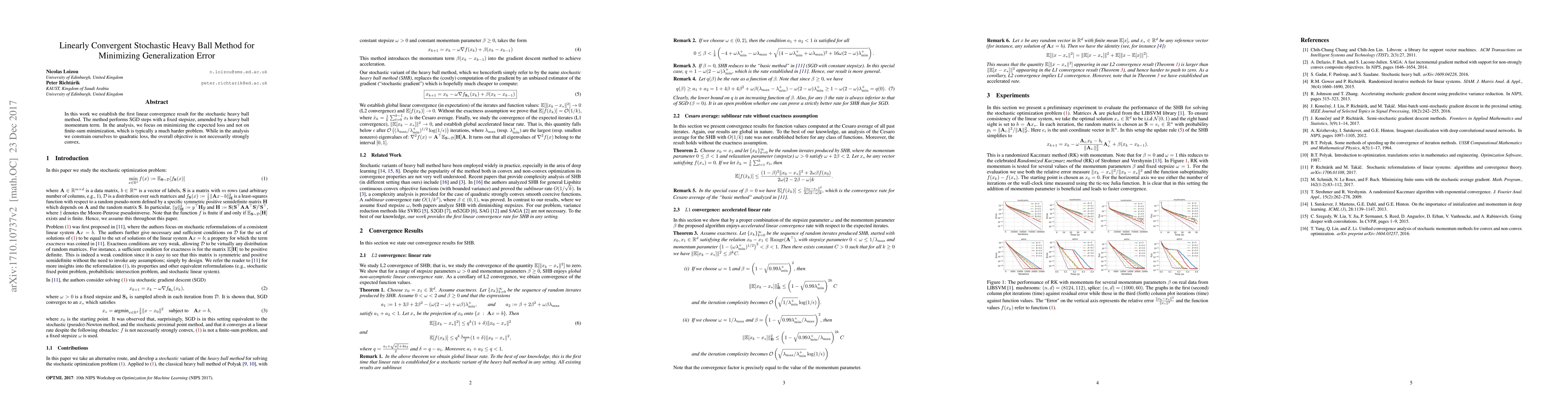 This paper presents a linearly convergent stochastic heavy ball method for minimizing generalization error, achieving linear convergence for the first time. The method combines SGD steps with a fixed stepsize and a heavy ball momentum term, focusing on expected loss minimization rather than finite-sum minimization.