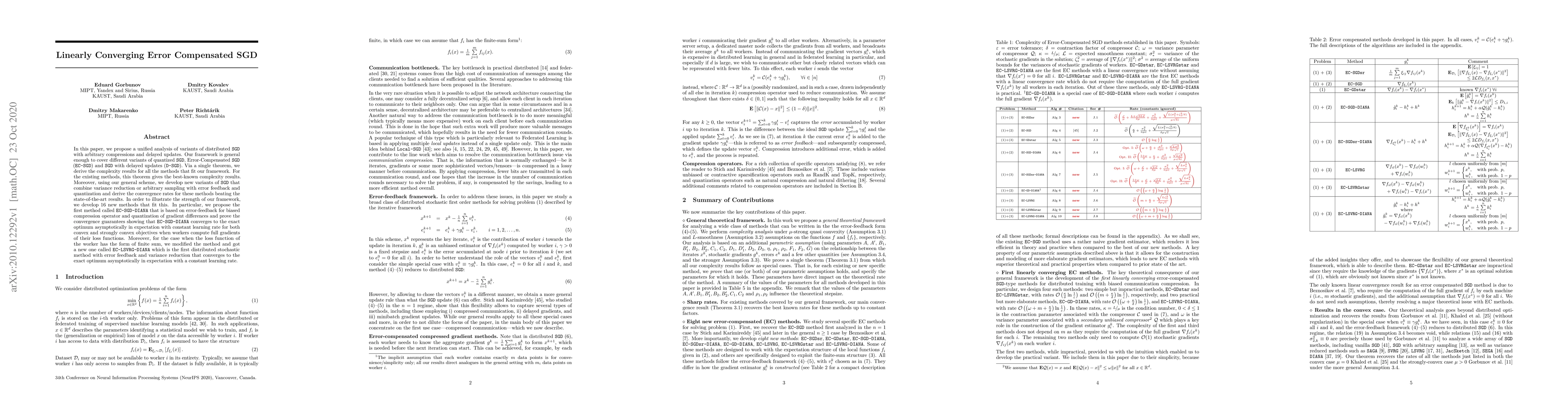 This paper presents a unified analysis of distributed SGD variants, including error-compensated and delayed updates, and develops new methods combining variance reduction and quantization. The proposed EC-SGD-DIANA and EC-LSVRG-DIANA methods achieve linearly converging error compensation and variance reduction, outperforming existing state-of-the-art techniques.