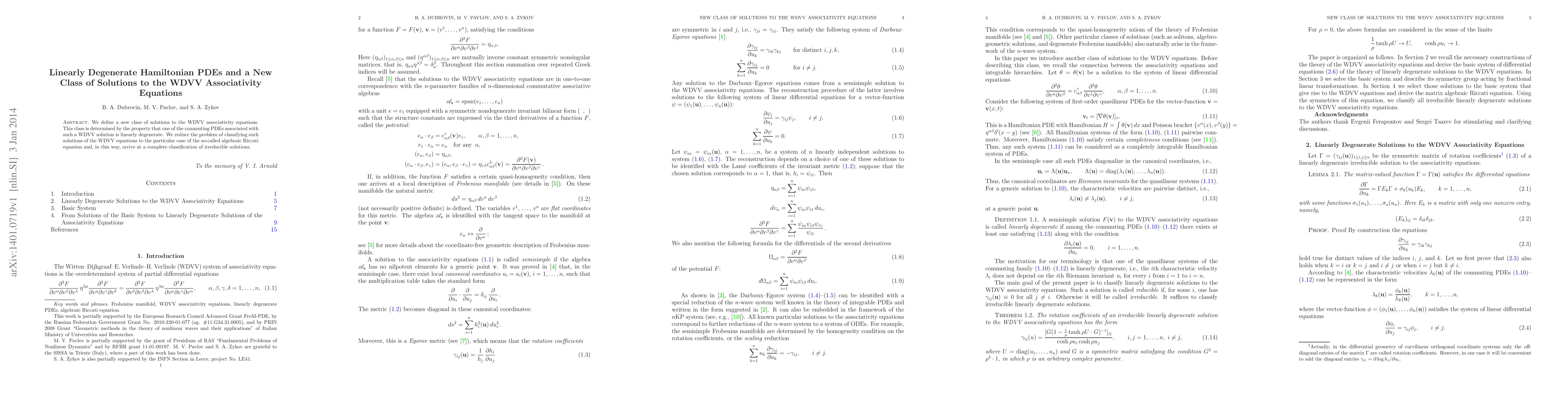 This paper introduces a new class of solutions to the WDVV associativity equations characterized by a linearly degenerate Hamiltonian PDE. It classifies these solutions by reducing the problem to the algebraic Riccati equation, leading to a complete classification of irreducible solutions.