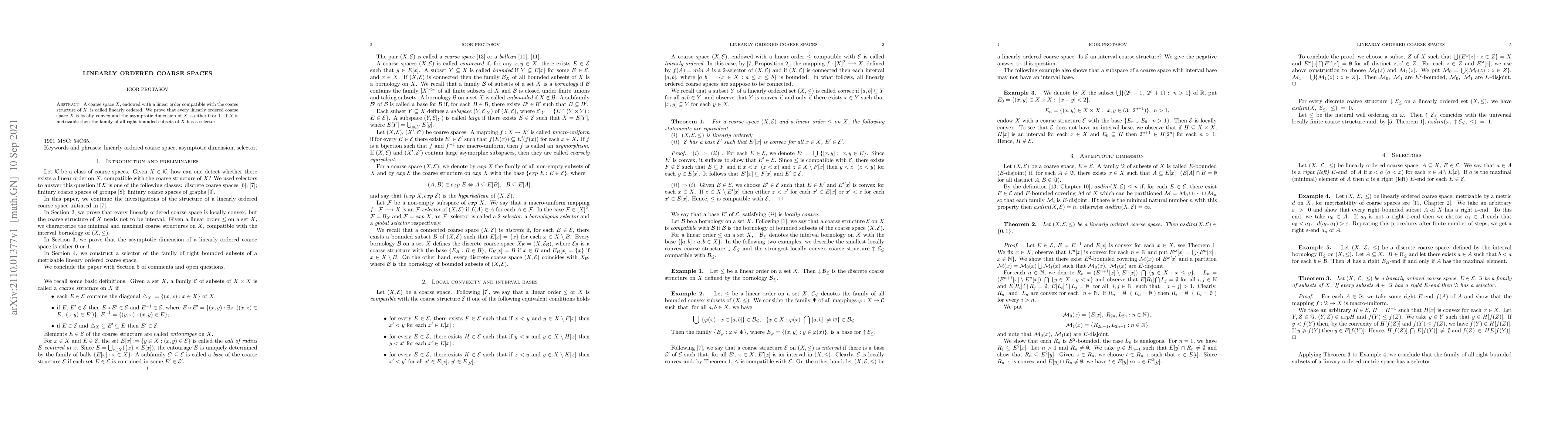 Summary: This paper explores linearly ordered coarse spaces, proving they are locally convex with asymptotic dimension of either $0$ or $1.$ For metrizable spaces, it shows the existence of a selector for the family of all right bounded subsets.