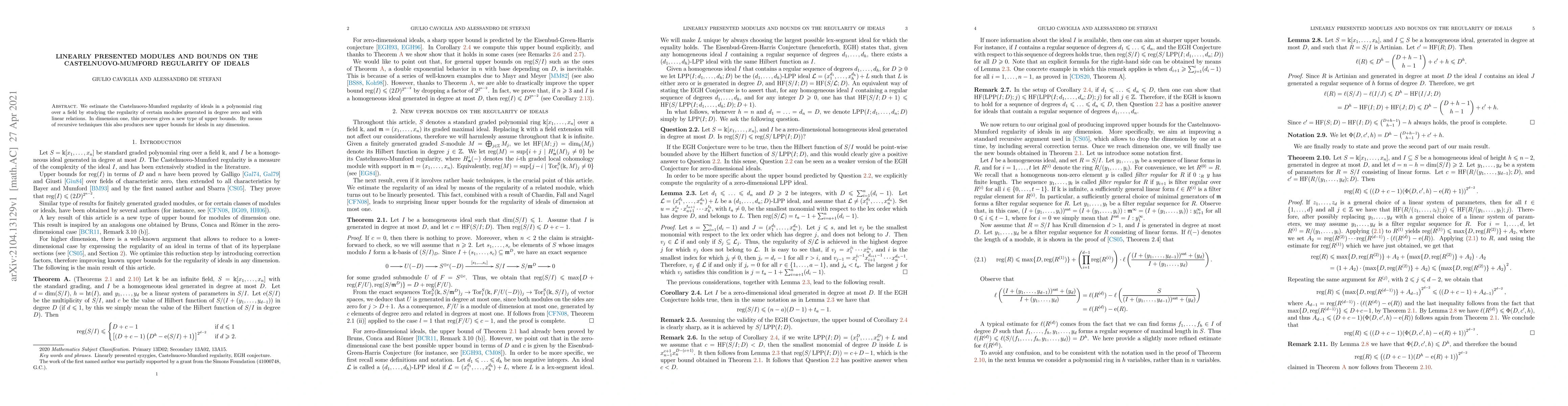 This paper estimates the Castelnuovo-Mumford regularity of ideals in polynomial rings through linearly presented modules, leading to new upper bounds for dimension one and recursive bounds for any dimension.