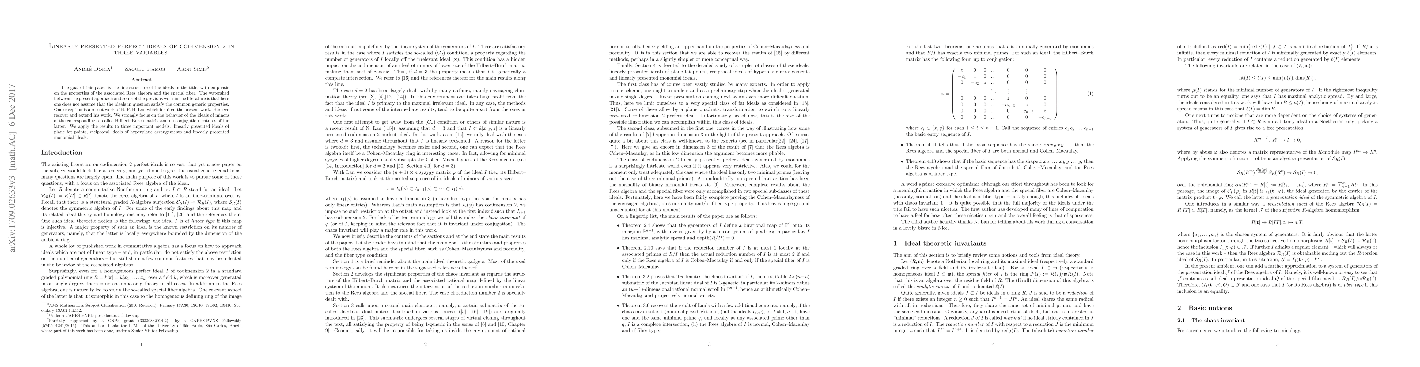 The goal of this paper is the fine structure of the ideals in the title, with emphasis on the properties of the associated Rees algebra and the special fiber. The watershed between the present approach and some of the previous work in the literature is that here one does not assume that the ideals in question satisfy the common generic properties. One exception is a recent work of N. P. H. Lan which inspired the present work. Here we recover and extend his work. We strongly focus on the behavior of the ideals of minors of the corresponding so-called Hilbert--Burch matrix and on conjugation features of the latter. We apply the results to three important models: linearly presented ideals of plane fat points, reciprocal ideals of hyperplane arrangements and linearly presented monomial ideals.