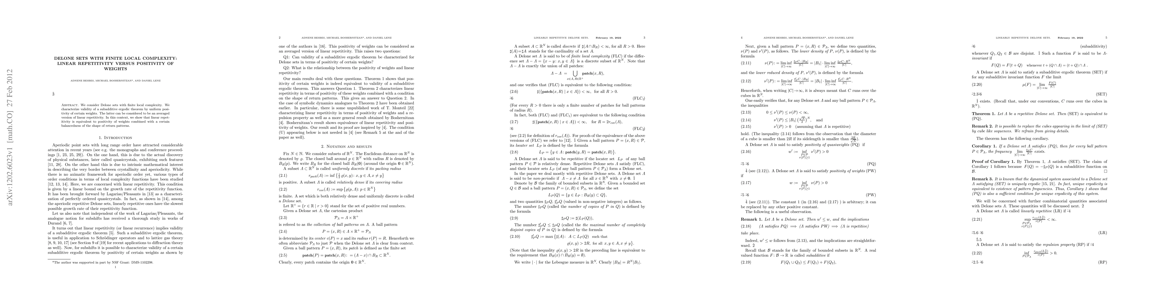 This paper investigates Delone sets with finite local complexity, demonstrating that linear repetitivity is equivalent to the uniform positivity of certain weights combined with a balanced shape of return patterns. The study characterizes the validity of a subadditive ergodic theorem through this equivalence.