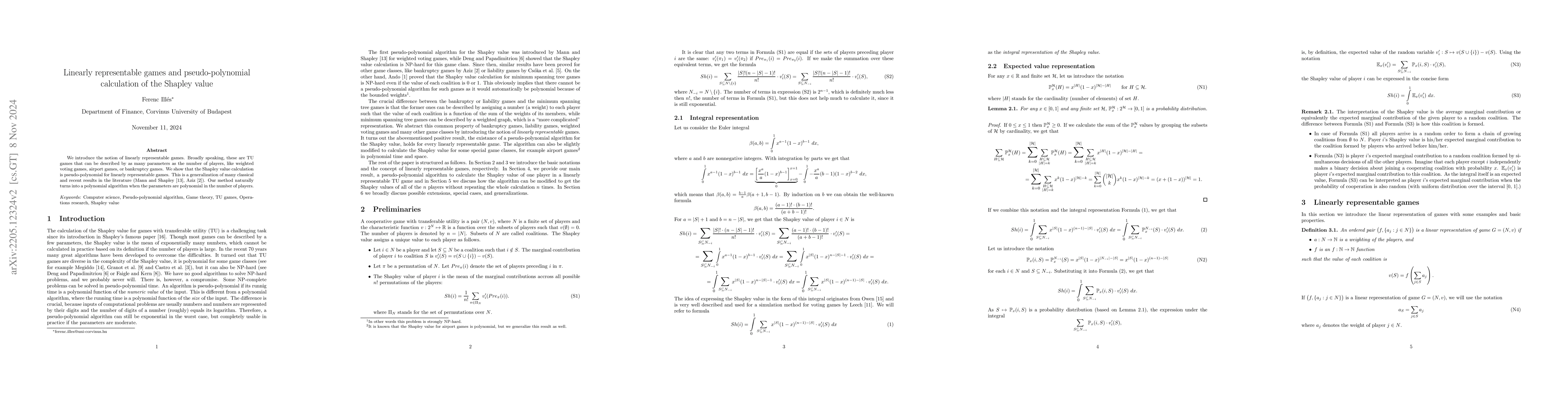 Summary: This paper introduces linearly representable games, which can be described by parameters equal to the number of players, and demonstrates that calculating the Shapley value for these games is pseudo-polynomial. The method generalizes existing results and becomes polynomial when parameters are polynomial in the number of players.