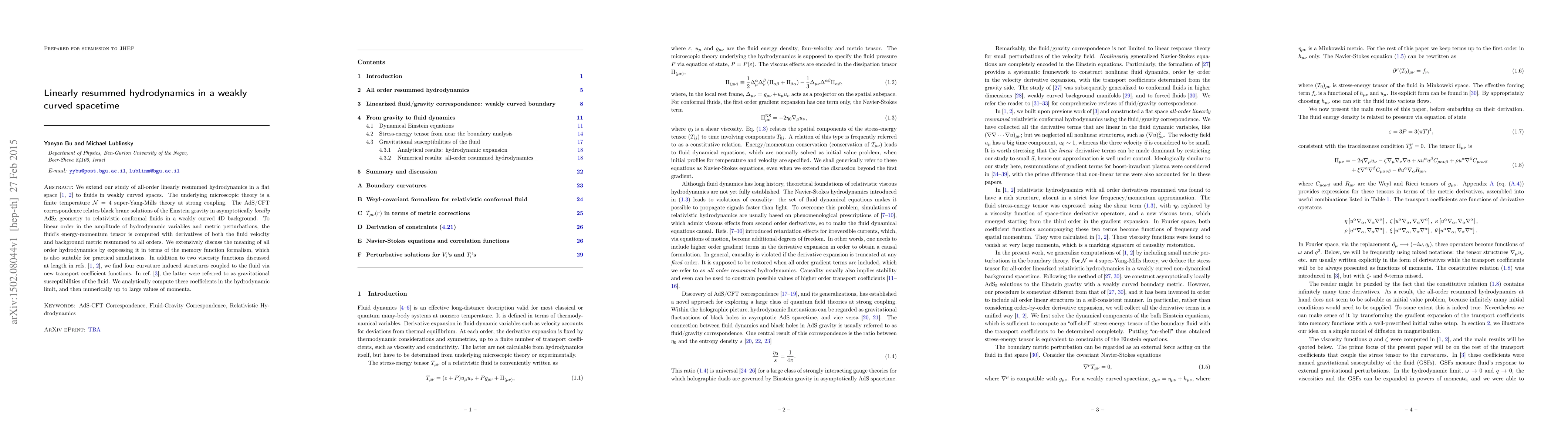 We extend our study of all-order linearly resummed hydrodynamics in a flat space~\cite{1406.7222,1409.3095} to fluids in weakly curved spaces. The underlying microscopic theory is a finite temperature $\mathcal{N}=4$ super-Yang-Mills theory at strong coupling. The AdS/CFT correspondence relates black brane solutions of the Einstein gravity in asymptotically \emph{locally} $\textrm{AdS}_5$ geometry to relativistic conformal fluids in a weakly curved 4D background. To linear order in the amplitude of hydrodynamic variables and metric perturbations, the fluid's energy-momentum tensor is computed with derivatives of both the fluid velocity and background metric resummed to all orders. We extensively discuss the meaning of all order hydrodynamics by expressing it in terms of the memory function formalism, which is also suitable for practical simulations. In addition to two viscosity functions discussed at length in refs.~\cite{1406.7222,1409.3095}, we find four curvature induced structures coupled to the fluid via new transport coefficient functions. In ref.~\cite{0905.4069}, the latter were referred to as gravitational susceptibilities of the fluid. We analytically compute these coefficients in the hydrodynamic limit, and then numerically up to large values of momenta.