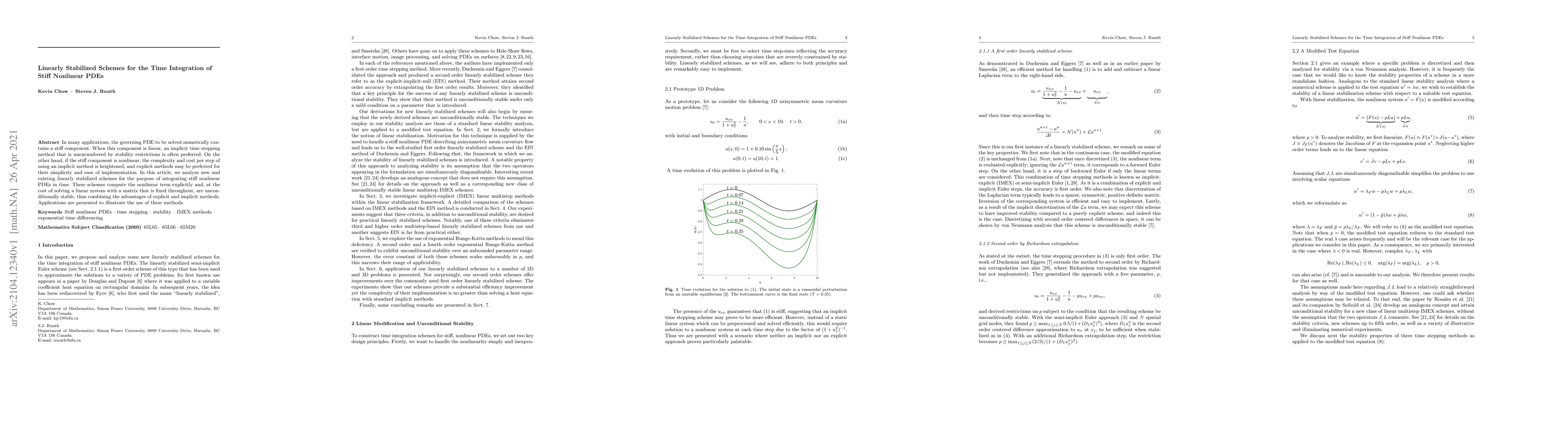 This paper explores linearly stabilized schemes for time integration of stiff nonlinear PDEs, which explicitly compute nonlinear terms and solve a fixed linear system, achieving unconditional stability while combining the benefits of explicit and implicit methods. Applications demonstrate the effectiveness of these schemes.