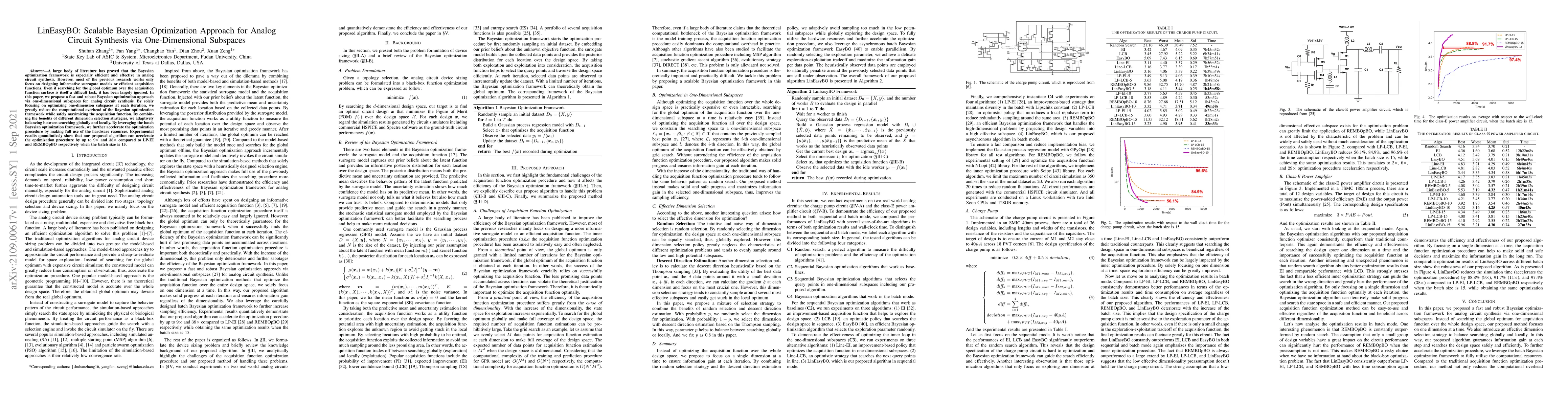 This paper introduces LinEasyBO, a scalable Bayesian optimization method for analog circuit synthesis using one-dimensional subspaces to reduce computational overhead. The approach balances global and local search strategies and leverages batch processing to accelerate optimization, achieving up to 9x and 38x speedups compared to LP-EI and REMBOpBO respectively.