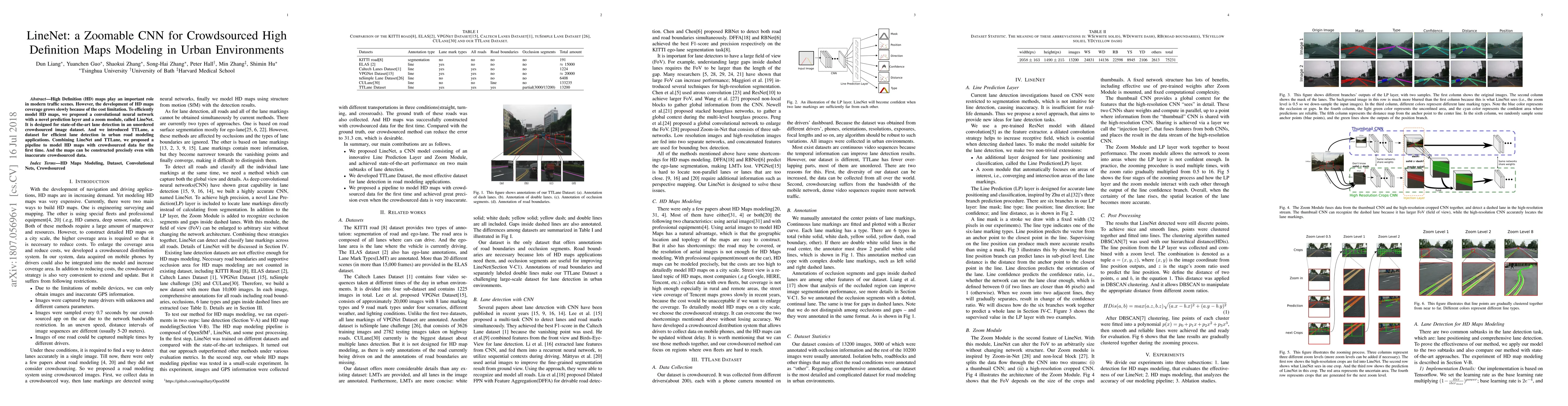 Here's a concise summary of the research paper: This paper introduces LineNet, a convolutional neural network designed for high-definition lane detection in urban environments using crowdsourced data. It features a novel prediction layer and a zoom module, enabling efficient modeling of HD maps even from less accurate crowdsourced images. The study also presents TTLane, a new dataset for lane detection, and proposes a pipeline for constructing precise HD maps using crowdsourced data.
