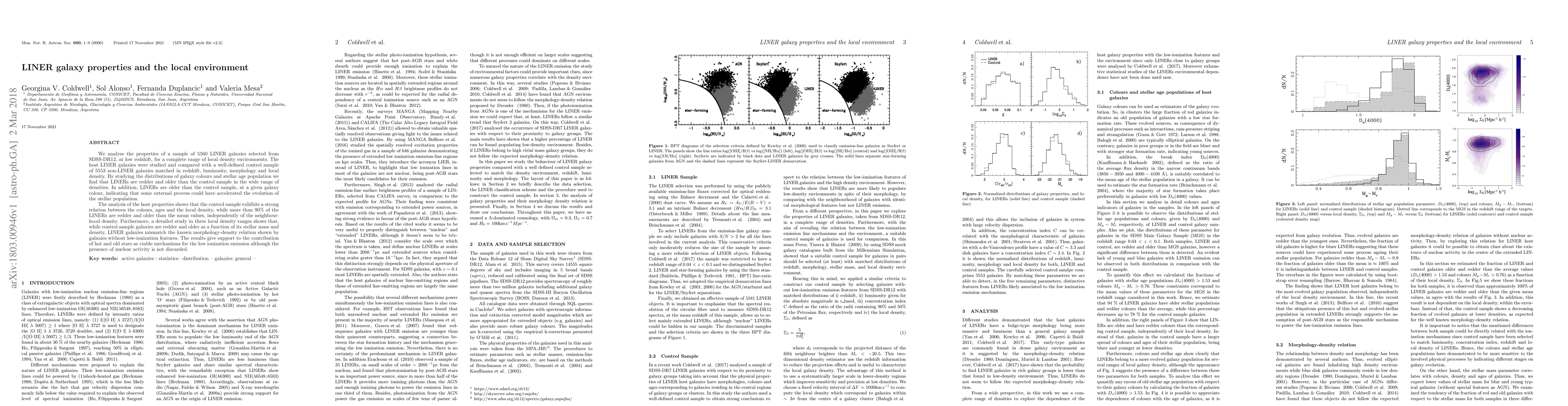 We analyse the properties of a sample of 5560 LINER galaxies selected from SDSS-DR12 at low redshift, for a complete range of local density environments. The host LINER galaxies were studied and compared with a well-defined control sample of 5553 non-LINER galaxies matched in red shift, luminosity, morphology and local density. By studying the distributions of galaxy colours and the stellar age population, we find that LINERs are redder and older than the control sample over a wide range of densities.In addition, LINERs are older than the control sample, at a given galaxy colour, indicating that some external process could have accelerated the evolution of the stellar population. The analysis of the host properties shows that the control sample exhibits a strong relation between colours, ages and the local density, while more than 90 per cent of the LINERs are redder and older than the mean values, independently of the neighbourhood density. Furthermore, a detailed study in three local density ranges shows that, while control sample galaxies are redder and older as a function of stellar mass and density, LINER galaxies mismatch the known morphology-density relation of galaxies without low-ionization features. The results support the contribution of hot and old stars to the low-ionization emission although the contribution of nuclear activity is not discarded.