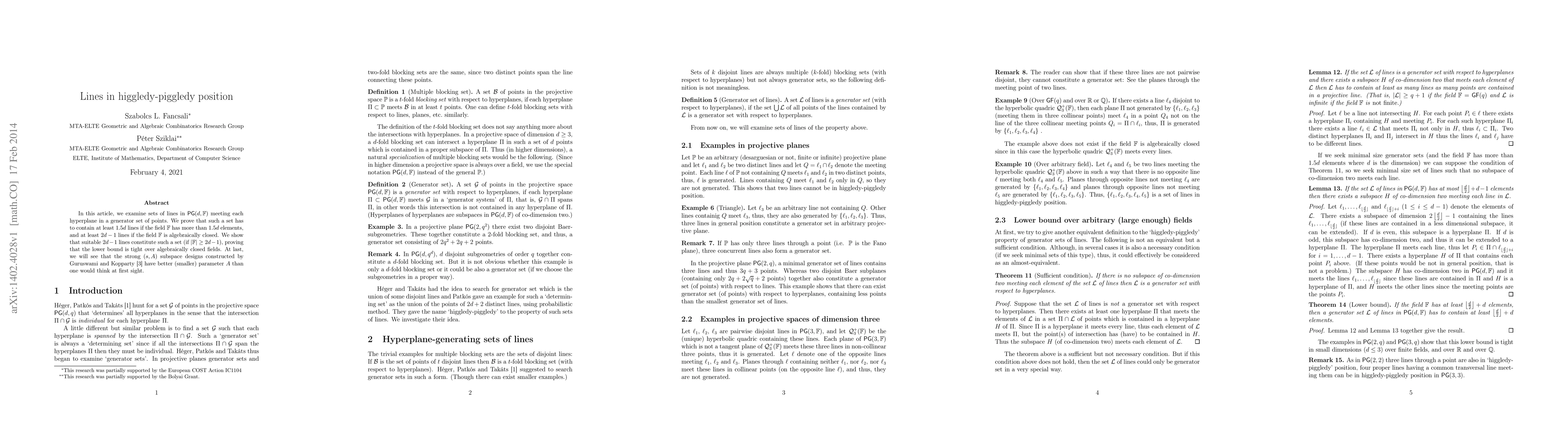 We examine sets of lines in PG(d,F) meeting each hyperplane in a generator set of points. We prove that such a set has to contain at least 1.5d lines if the field F has more than 1.5d elements, and at least 2d-1 lines if the field F is algebraically closed. We show that suitable 2d-1 lines constitute such a set (if |F| > or = 2d-1), proving that the lower bound is tight over algebraically closed fields. At last, we will see that the strong (s,A) subspace designs constructed by Guruswami and Kopparty have better (smaller) parameter A than one would think at first sight.