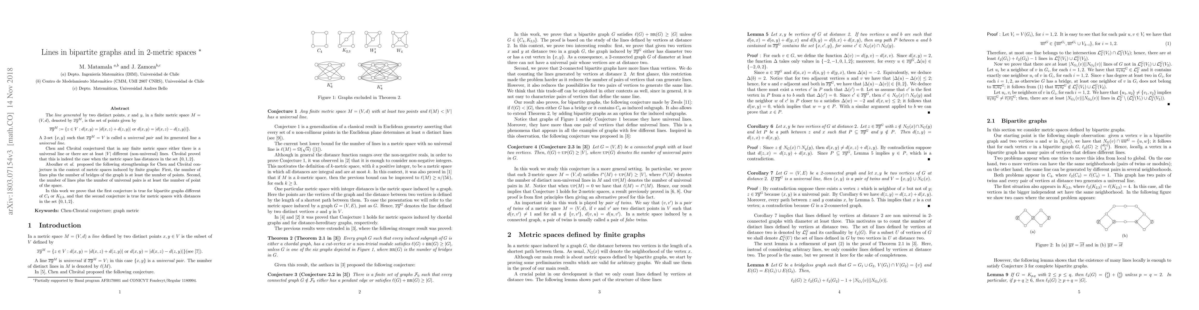 The line generated by two distinct points, $x$ and $y$, in a finite metric space $M=(V,d)$, denoted by $\overline{xy}^M$, is the set of points given by $$\overline{xy}^M:=\{z\in V: d(x,y)=|d(x,z)\pm d(z,y)|\}.$$ A 2-set $\{x,y\}$ such that $\overline{xy}^M=V$ is called a universal pair and its associated line a universal line. Chen and Chv\'atal conjectured that in any finite metric space either there is a universal line or there are at least $|V|$ different (non-universal) lines. Chv\'atal proved that this is indeed the case when the metric space has distances in the set $\{0,1,2\}$. Aboulker et al. proposed the following strengthening for Chen and Chv\'atal conjecture in the context of metric spaces induced by finite graphs. The number of lines plus the number of universal pairs is at least the number of point of the space. In this work we first prove that metric spaces with distances in the set $\{0,1,2\}$ satisfy this stronger conjecture. We also prove that for metric spaces induced by bipartite graphs the number of lines plus the number of bridges of the graph is at least the number its vertices, unless the graph is $C_4$ or $K_{2,3}$.