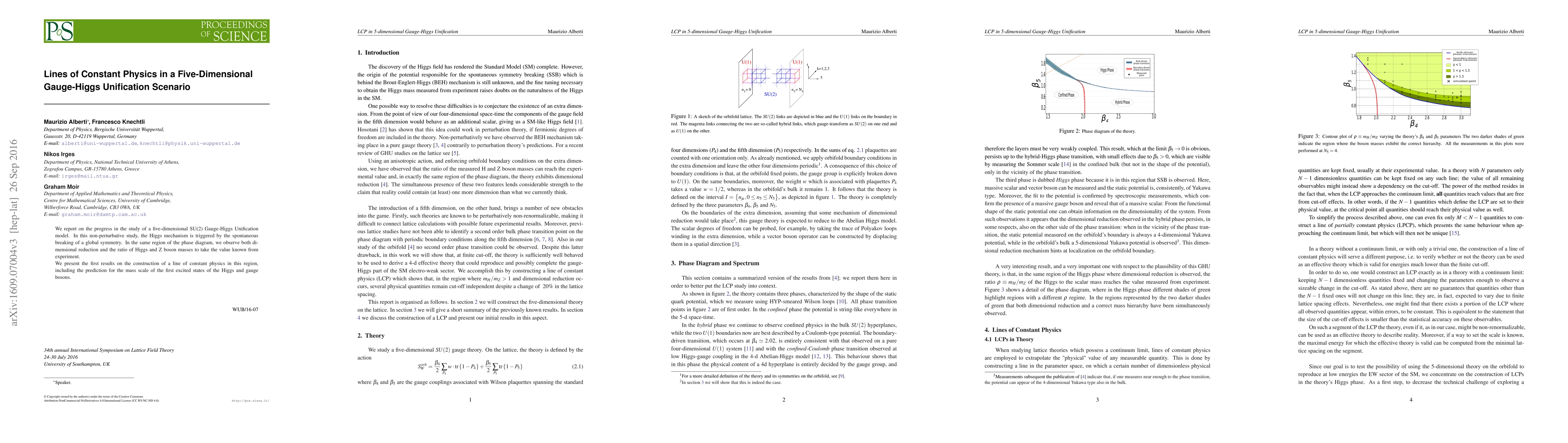We report on the progress in the study of a five-dimensional SU(2) Gauge-Higgs Unification model. In this non-perturbative study, the Higgs mechanism is triggered by the spontaneous breaking of a global symmetry. In the same region of the phase diagram, we observe both dimensional reduction and the ratio of Higgs and Z boson masses to take the value known from experiment. We present the first results on the construction of a line of constant physics in this region, including the prediction for the mass scale of the first excited states of the Higgs and gauge bosons.
