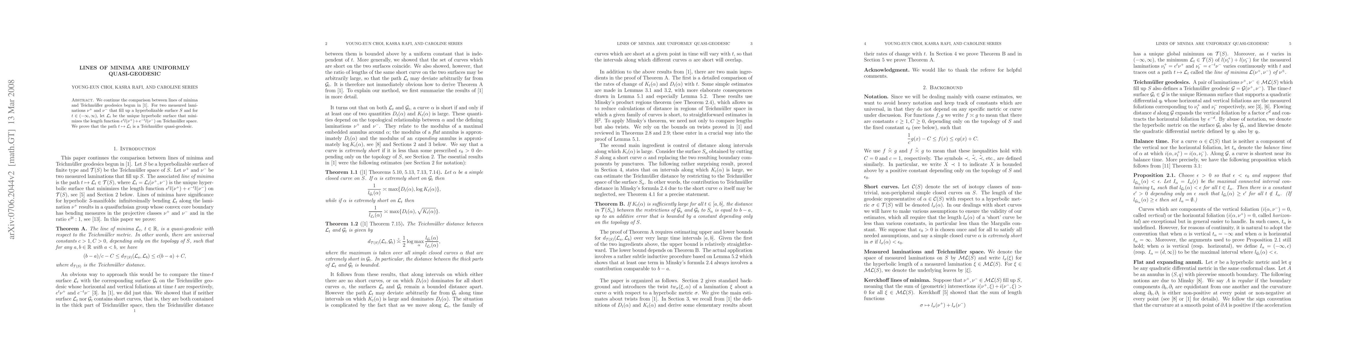Title: Lines of minima are uniformly quasi-geodesic Summary: This paper demonstrates that lines of minima in Teichmueller space of a surface S are quasi-geodesic with respect to the Teichmueller metric, with quasi-geodesic constants dependent solely on the topological type of S.