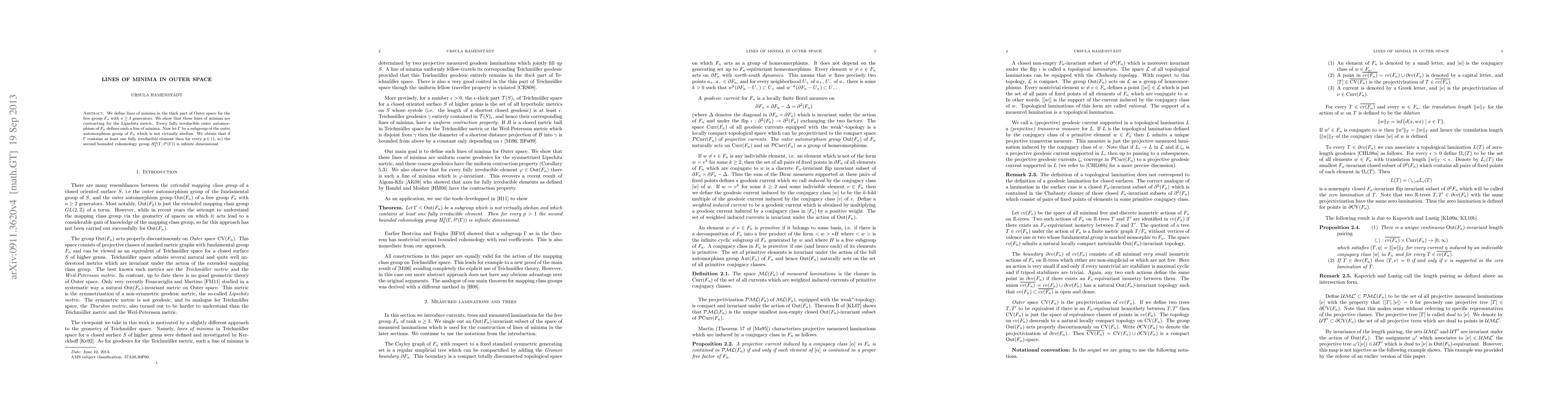 This paper defines lines of minima in Outer space for free groups with more than two generators, showing they are contracting under the Lipschitz metric. It also proves that fully irreducible outer automorphisms define these lines and establishes that if a subgroup of the outer automorphism group contains a fully irreducible element, then the second bounded cohomology group with lp coefficients is infinite-dimensional.