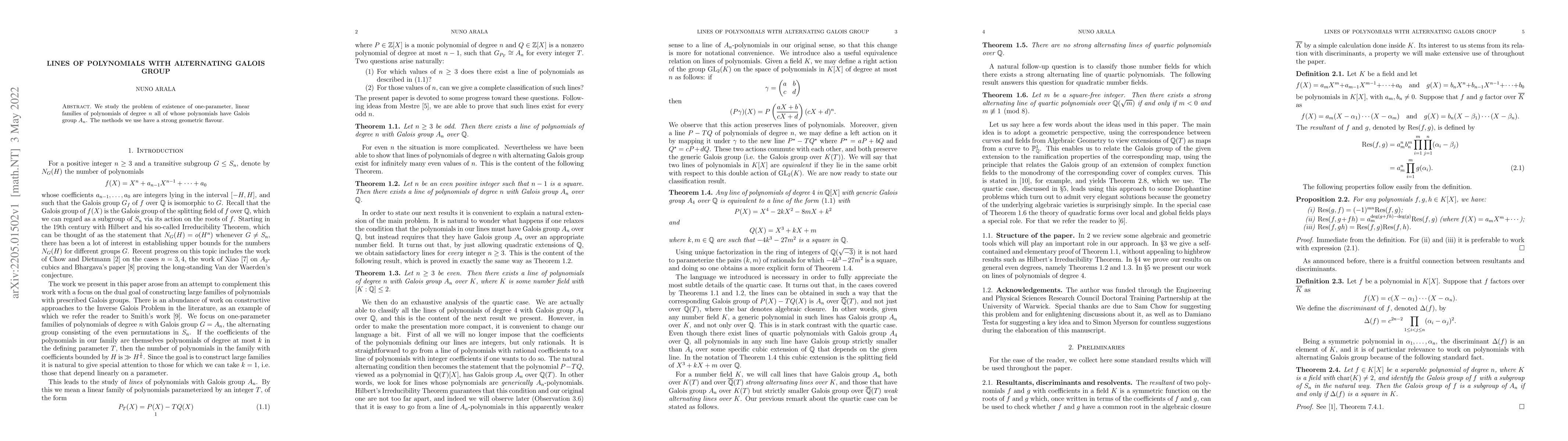 Summary: This paper investigates the existence of one-parameter, linear families of degree n polynomials whose Galois groups are all alternating, employing geometric methods to explore this problem.