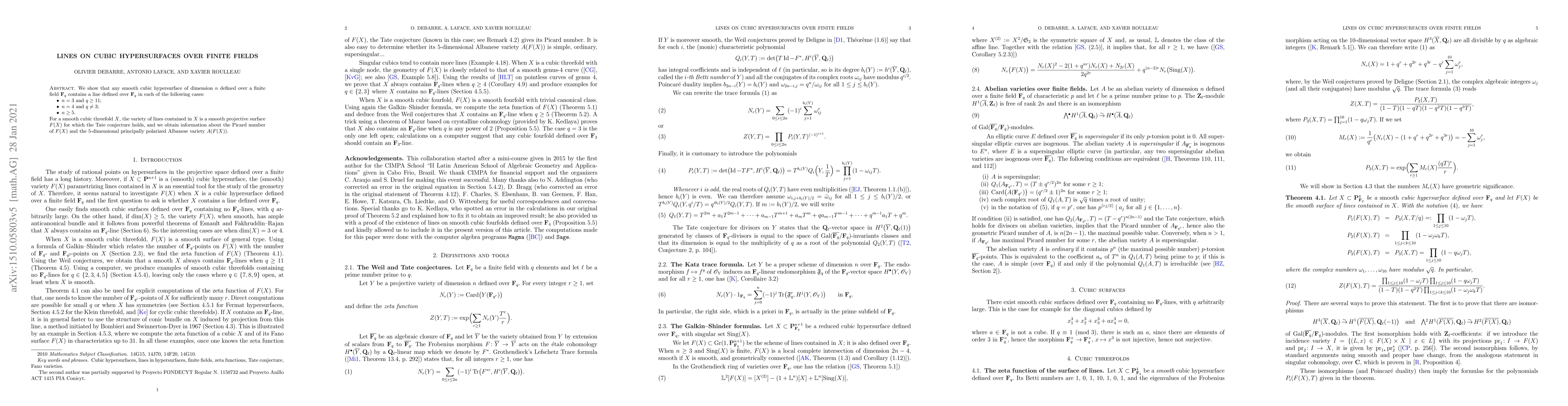 This paper demonstrates that smooth cubic hypersurfaces over finite fields ${\bf F}_q$ contain lines defined over ${\bf F}_q$ under specific conditions, and provides insights into the geometry of the variety of lines contained in a cubic threefold, including the Tate conjecture for its associated surface.