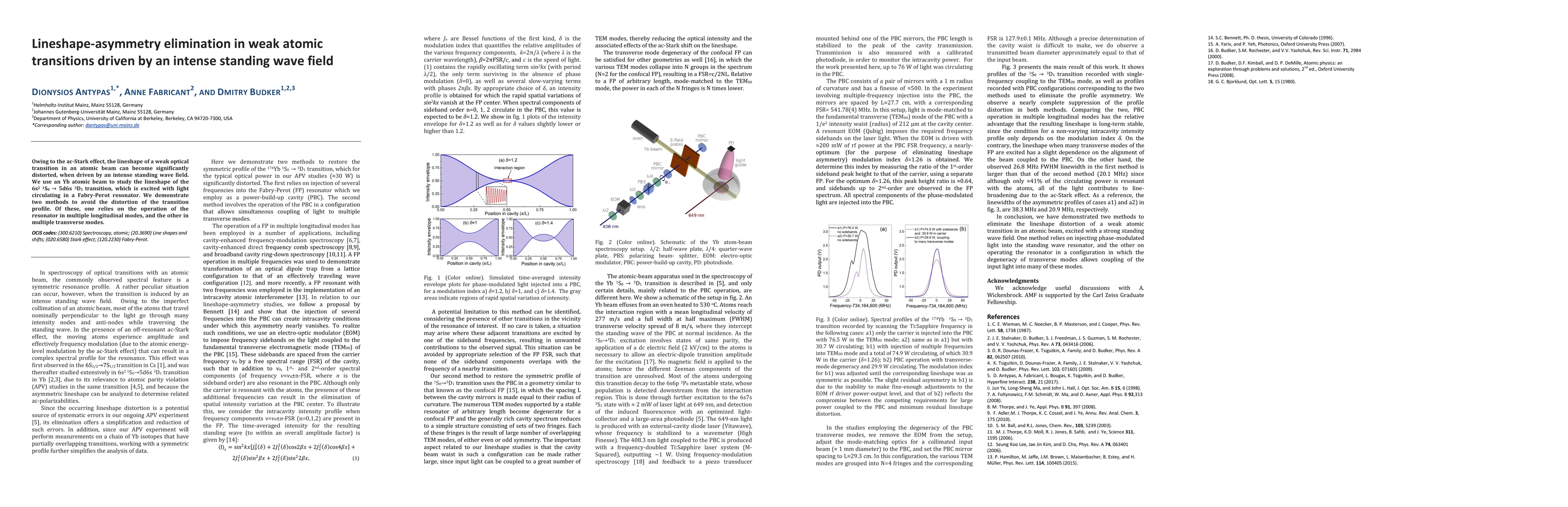 This paper explores the distortion of weak atomic transitions in an Yb atomic beam caused by the ac-Stark effect in an intense standing wave field. It demonstrates two methods to eliminate lineshape asymmetry: operating the Fabry-Perot resonator in multiple longitudinal modes or in multiple transverse modes.