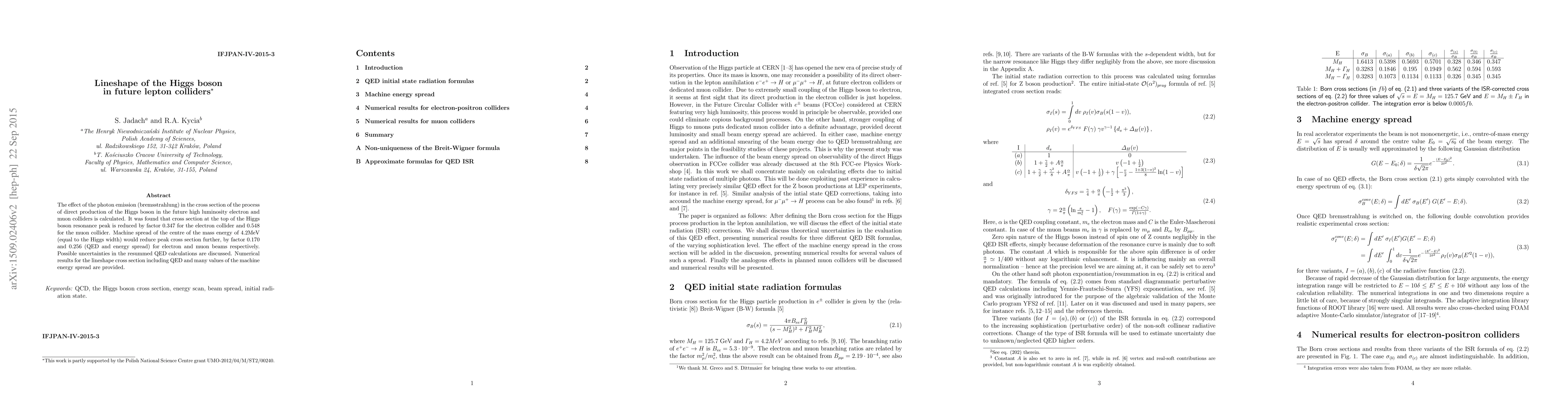 The effect of the photon emission (bremsstrahlung) in the cross section of the process of direct production of the Higgs boson in the future high luminosity electron and muon colliders is calculated. It was found that cross section at the top of the Higgs boson resonance peak is reduced by factor 0.347 for the electron collider and 0.548 for the muon collider. Machine spread of the centre of the mass energy of 4.2MeV (equal to the Higgs width) would reduce peak cross section further, by factor 0.170 and 0.256 (QED and energy spread) for electron and muon beams respectively. Possible uncertainties in the resummed QED calculations are discussed. Numerical results for the lineshape cross section including QED and many values of the machine energy spread are provided.