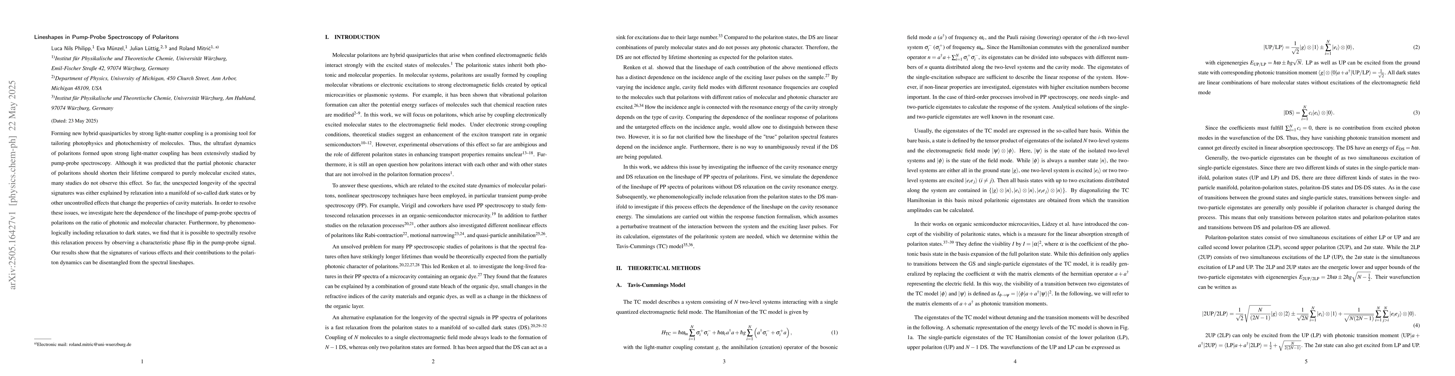 The research investigates the dependence of pump-probe spectra lineshapes of polaritons on the photonic-molecular character ratio, incorporating relaxation to dark states to resolve discrepancies in polariton lifetimes.