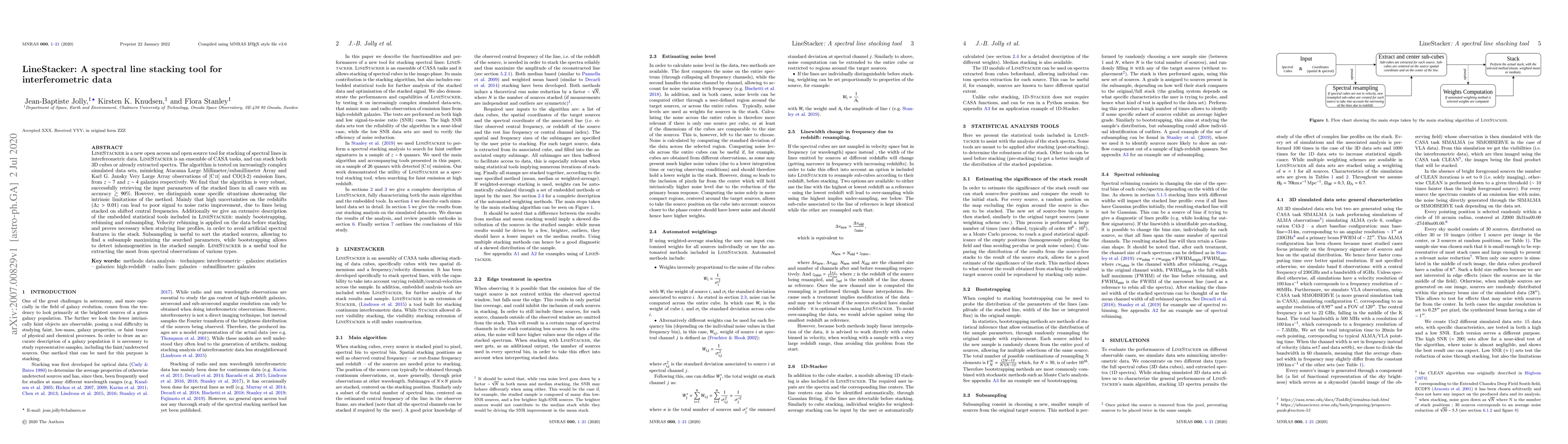 LineStacker is a new open access and open source tool for stacking of spectral lines in interferometric data. LineStacker is an ensemble of CASA tasks, and can stack both 3D cubes or already extracted spectra. The algorithm is tested on increasingly complex simulated data sets, mimicking Atacama Large Millimeter/submillimeter Array and Karl G. Jansky Very Large Array observations of [CII] and CO(3-2) emission lines, from $z\sim7$ and $z\sim4$ galaxies respectively. We find that the algorithm is very robust, successfully retrieving the input parameters of the stacked lines in all cases with an accuracy $\gtrsim90$\%. However, we distinguish some specific situations showcasing the intrinsic limitations of the method. Mainly that high uncertainties on the redshifts ($\Delta z > 0.01$) can lead to poor signal to noise ratio improvement, due to lines being stacked on shifted central frequencies. Additionally we give an extensive description of the embedded statistical tools included in LineStacker: mainly bootstrapping, rebinning and subsampling. Velocity rebinning {is applied on the data before stacking and} proves necessary when studying line profiles, in order to avoid artificial spectral features in the stack. Subsampling is useful to sort the stacked sources, allowing to find a subsample maximizing the searched parameters, while bootstrapping allows to detect inhomogeneities in the stacked sample. LineStacker is a useful tool for extracting the most from spectral observations of various types.