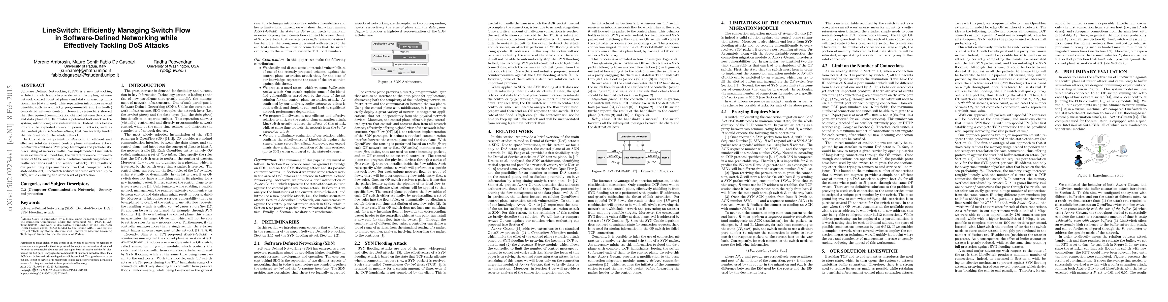 Software Defined Networking (SDN) is a new networking architecture which aims to provide better decoupling between network control (control plane) and data forwarding functionalities (data plane). This separation introduces several benefits, such as a directly programmable and (virtually) centralized network control. However, researchers showed that the required communication channel between the control and data plane of SDN creates a potential bottleneck in the system, introducing new vulnerabilities. Indeed, this behavior could be exploited to mount powerful attacks, such as the control plane saturation attack, that can severely hinder the performance of the whole network. In this paper we present LineSwitch, an efficient and effective solution against control plane saturation attack. LineSwitch combines SYN proxy techniques and probabilistic blacklisting of network traffic. We implemented LineSwitch as an extension of OpenFlow, the current reference implementation of SDN, and evaluate our solution considering different traffic scenarios (with and without attack). The results of our preliminary experiments confirm that, compared to the state-of-the-art, LineSwitch reduces the time overhead up to 30%, while ensuring the same level of protection.