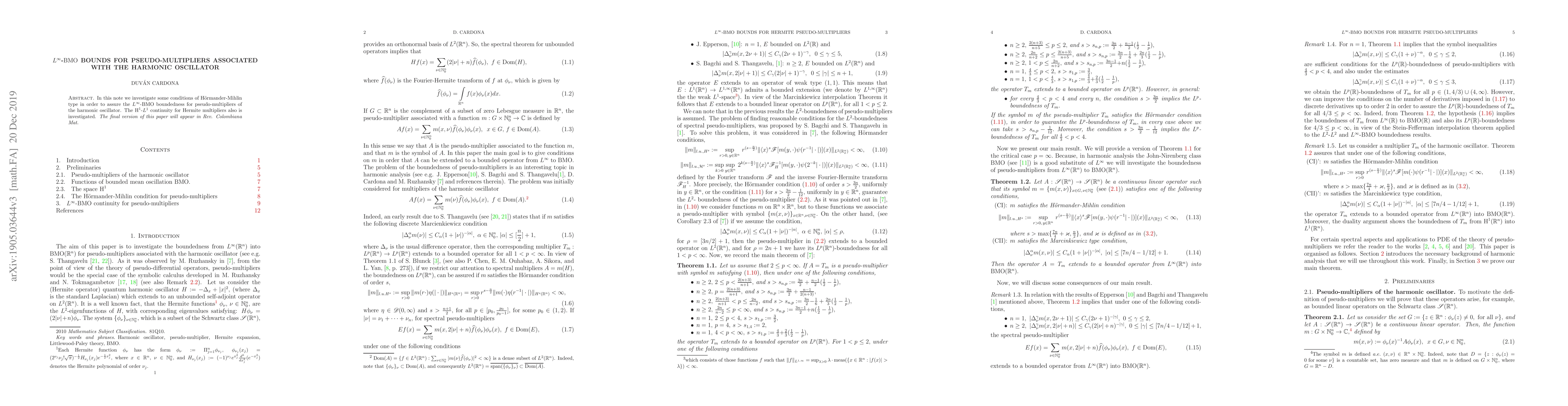 This paper explores H\"ormander-Mihlin conditions to ensure $L^\infty$-$\textnormal{BMO}$ boundedness for pseudo-multipliers linked to the harmonic oscillator, and investigates $\textnormal{H}^1$-$L^1$ continuity for Hermite multipliers. The full version will be published in Rev. Colombiana Mat.