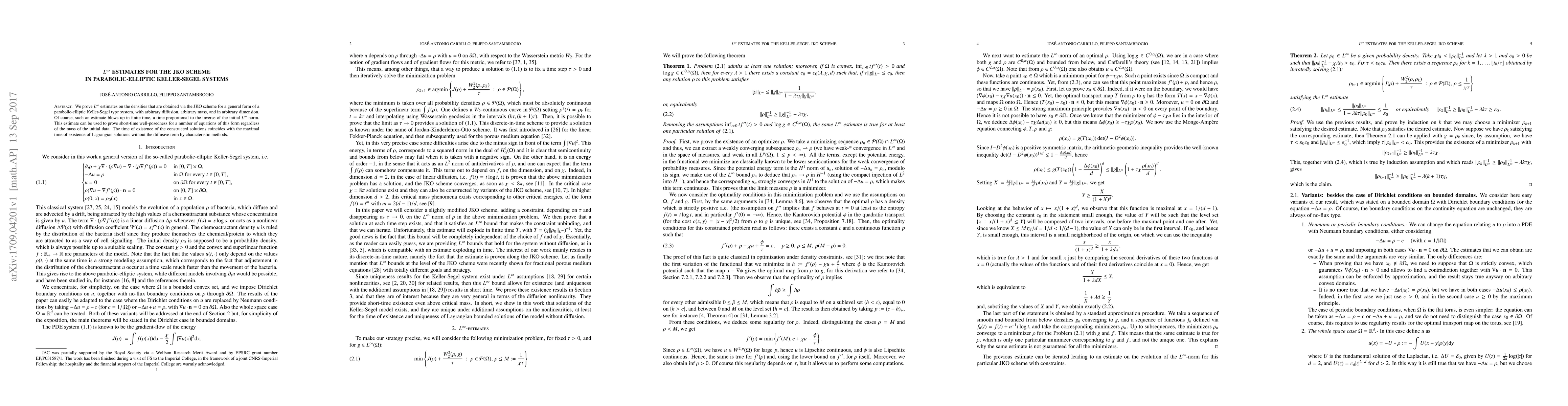 We prove L^$\infty$ estimates on the densities that are obtained via the JKO scheme for a general form of a parabolic-elliptic Keller-Segel type system, with arbitrary diffusion, arbitrary mass, and in arbitrary dimension. Of course, such an estimate blows up in finite time, a time proportional to the inverse of the initial L^$\infty$ norm. This estimate can be used to prove short-time well-posedness for a number of equations of this form regardless of the mass of the initial data. The time of existence of the constructed solutions coincides with the maximal time of existence of Lagrangian solutions without the diffusive term by characteristic methods.