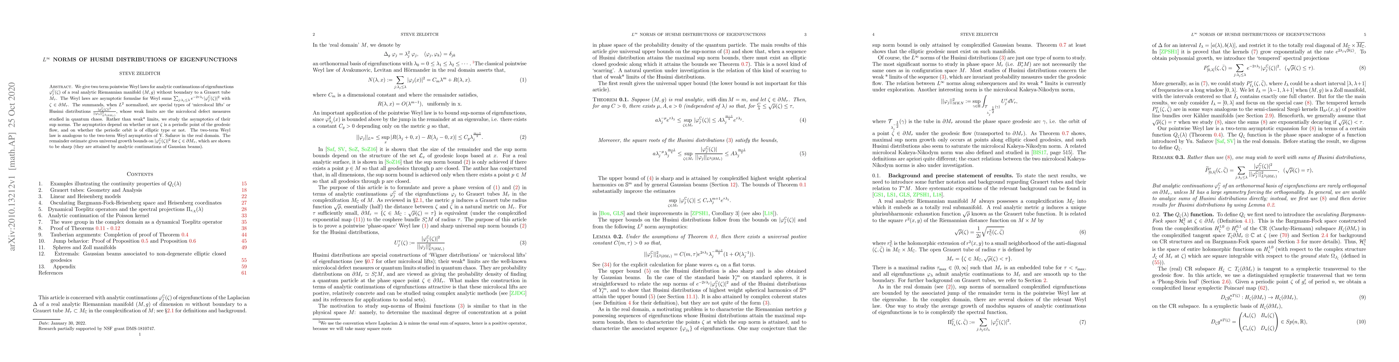 Husimi distributions of Laplace eigenfunctions are special types of `microlocal lifts' of eigenfunctions to phase space. Their weak * limits are the well-known quantum limits or microlocal defect measures of an orthonormal basis $\{ \phi_j\}$ of eigenfunctions on a Riemannian manifold $(M,g)$ . Husimi distributions are normalized mod squares of analytic continuations of eigenfunctions to the complexification of $M$, which may be identified with an open subset of the cotangent bundle $T^*M$. Husimi distributions are probability measures whose density at $\zeta$ is the probability density of a quantum particle at the phase space point $\zeta$. We given universal upper bounds on the sup norms of the Husimi distributions. We also give necessary conditions to obtain the upper bounds in terms of the type of the geodesic through $\zeta$. The bounds are sharp and are achieved by complexified Gaussian beams. These results open the question of relating sup norms (or other natural norms) of Husimi distributions to properties of the weak * limits.