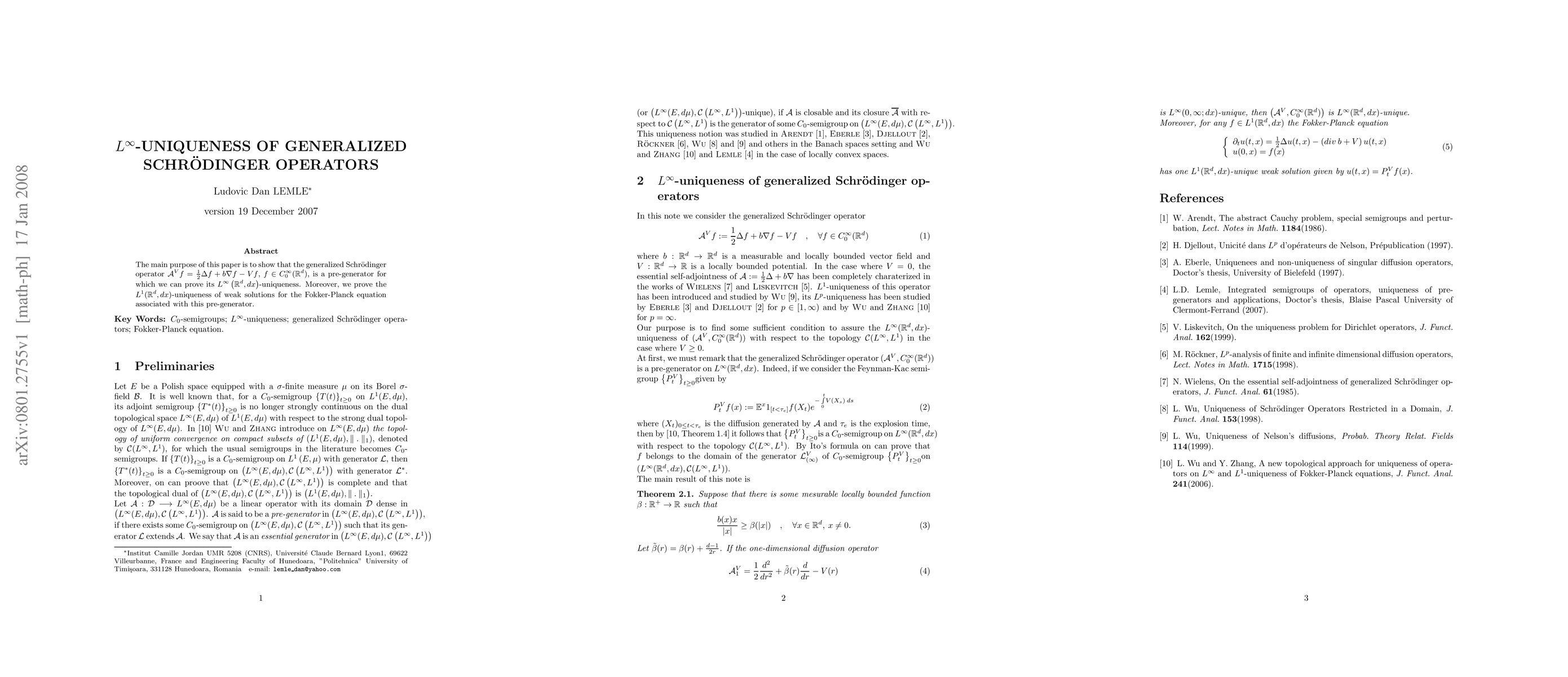The main purpose of this paper is to show that the generalized Schr\"odinger operator ${\cal A}^Vf={1/2}\Delta f+b\nabla f-Vf$, $f\in C_0^\infty(\R^d)$, is a pre-generator for which we can prove its $L^\infty(\R^d,dx)$-uniqueness. Moreover, we prove the $L^1(\R^d,dx)$-uniqueness of weak solutions for the Fokker-Planck equation associated with this pre-generator.