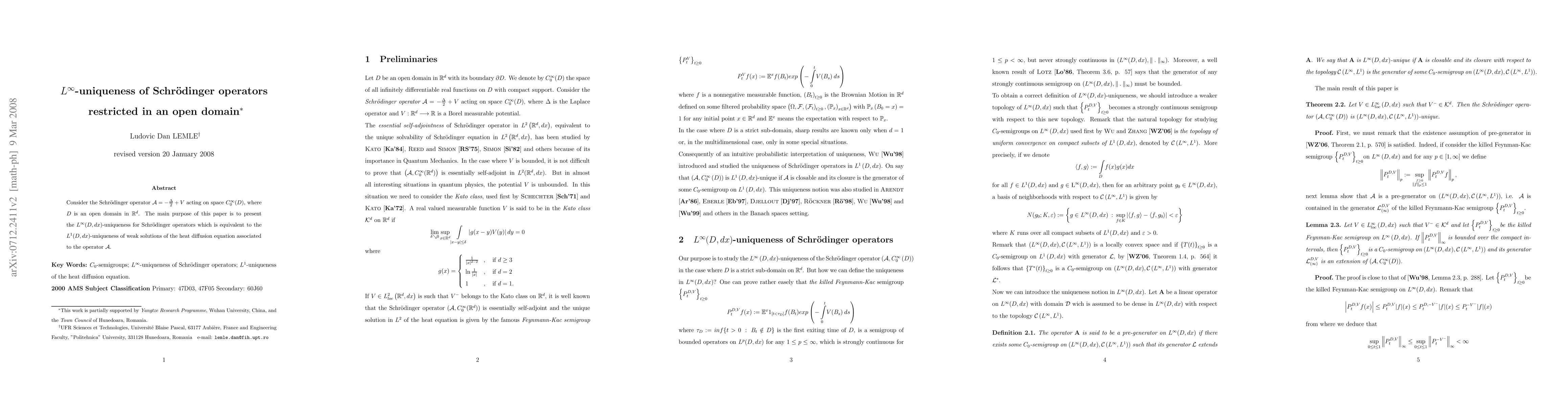 Consider the Schr\"odinger operator ${\cal A}=-\frac{\Delta}{2}+V$ acting on space $C_0^\infty(D)$, where $D$ is an open domain in $\R^d$. The main purpose of this paper is to present the $L^\infty(D,dx)$-uniqueness for Schr\"odinger operators which is equivalent to the $L^1(D,dx)$-uniqueness of weak solutions of the heat diffusion equation associated to the operator $\cal A$.