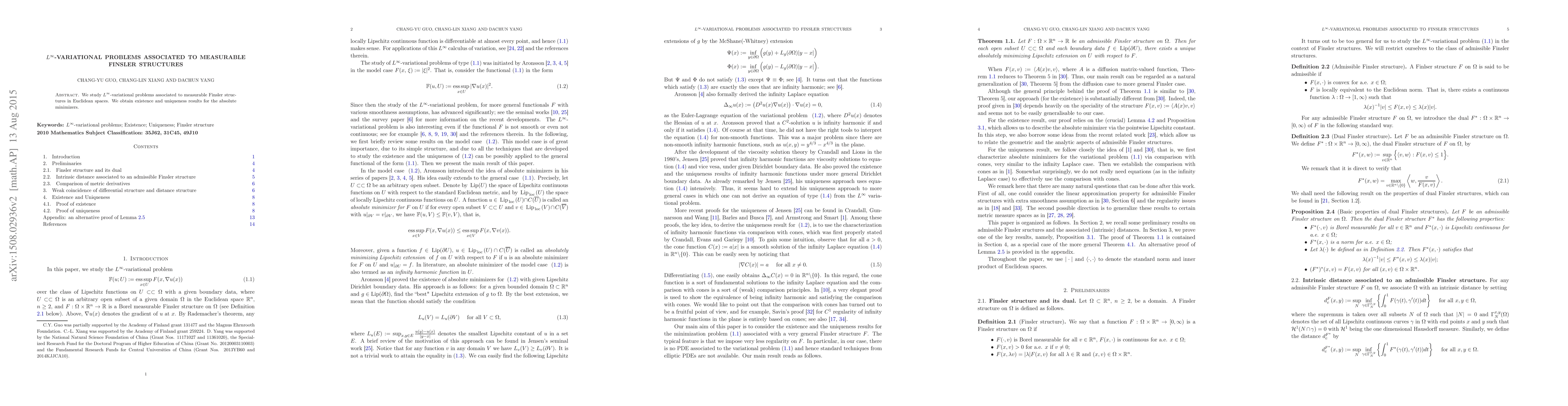 We study $L^\infty$-variational problems associated to measurable Finsler structures in Euclidean spaces. We obtain existence and uniqueness results for the absolute minimizers.