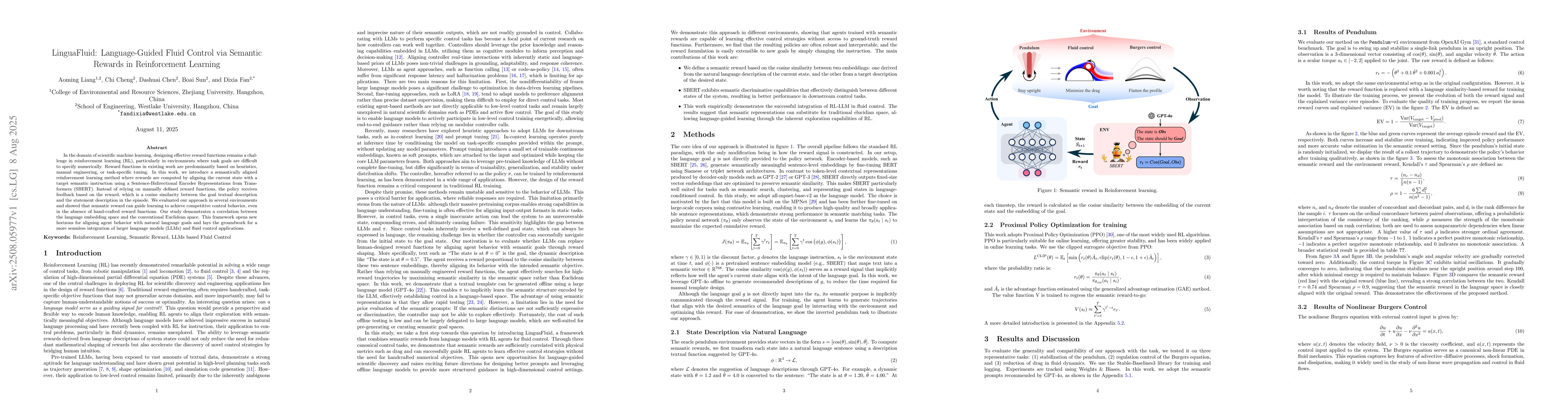 In the domain of scientific machine learning, designing effective reward functions remains a challenge in reinforcement learning (RL), particularly in environments where task goals are difficult to specify numerically. Reward functions in existing work are predominantly based on heuristics, manual engineering, or task-specific tuning. In this work, we introduce a semantically aligned reinforcement learning method where rewards are computed by aligning the current state with a target semantic instruction using a Sentence-Bidirectional Encoder Representations from Transformers (SBERT). Instead of relying on manually defined reward functions, the policy receives feedback based on the reward, which is a cosine similarity between the goal textual description and the statement description in the episode. We evaluated our approach in several environments and showed that semantic reward can guide learning to achieve competitive control behavior, even in the absence of hand-crafted reward functions. Our study demonstrates a correlation between the language embedding space and the conventional Euclidean space. This framework opens new horizons for aligning agent behavior with natural language goals and lays the groundwork for a more seamless integration of larger language models (LLMs) and fluid control applications.