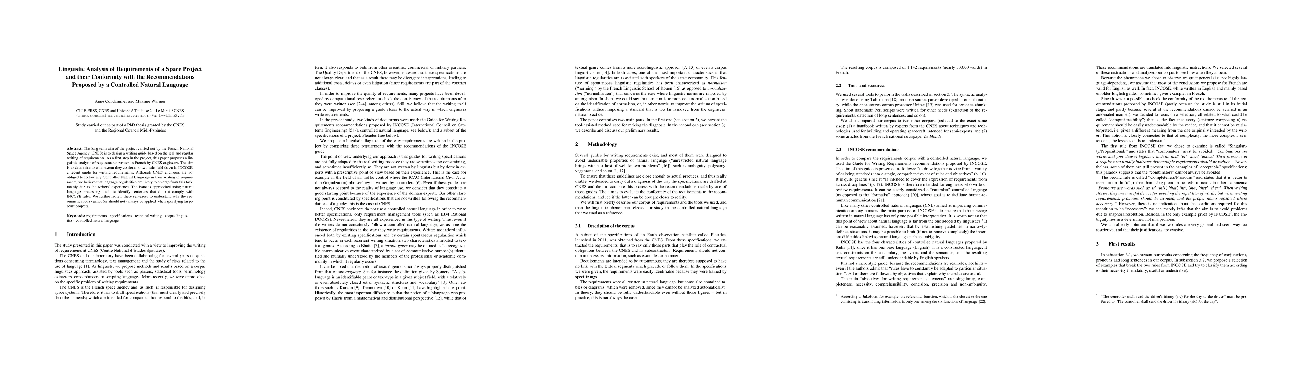 The long term aim of the project carried out by the French National Space Agency (CNES) is to design a writing guide based on the real and regular writing of requirements. As a first step in the project, this paper proposes a lin-guistic analysis of requirements written in French by CNES engineers. The aim is to determine to what extent they conform to two rules laid down in INCOSE, a recent guide for writing requirements. Although CNES engineers are not obliged to follow any Controlled Natural Language in their writing of requirements, we believe that language regularities are likely to emerge from this task, mainly due to the writers' experience. The issue is approached using natural language processing tools to identify sentences that do not comply with INCOSE rules. We further review these sentences to understand why the recommendations cannot (or should not) always be applied when specifying large-scale projects.