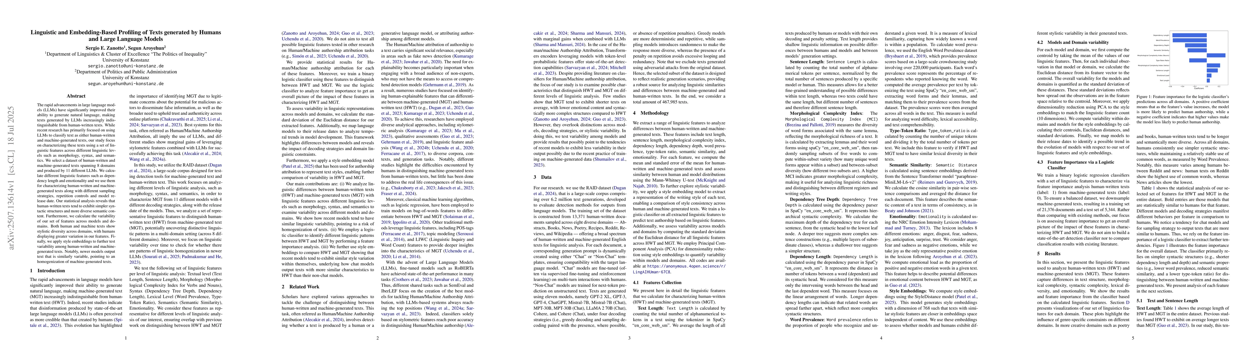 The paper presents a comprehensive analysis of linguistic features distinguishing human-written texts from machine-generated ones, utilizing a dataset of texts from various domains produced by multiple LLMs.