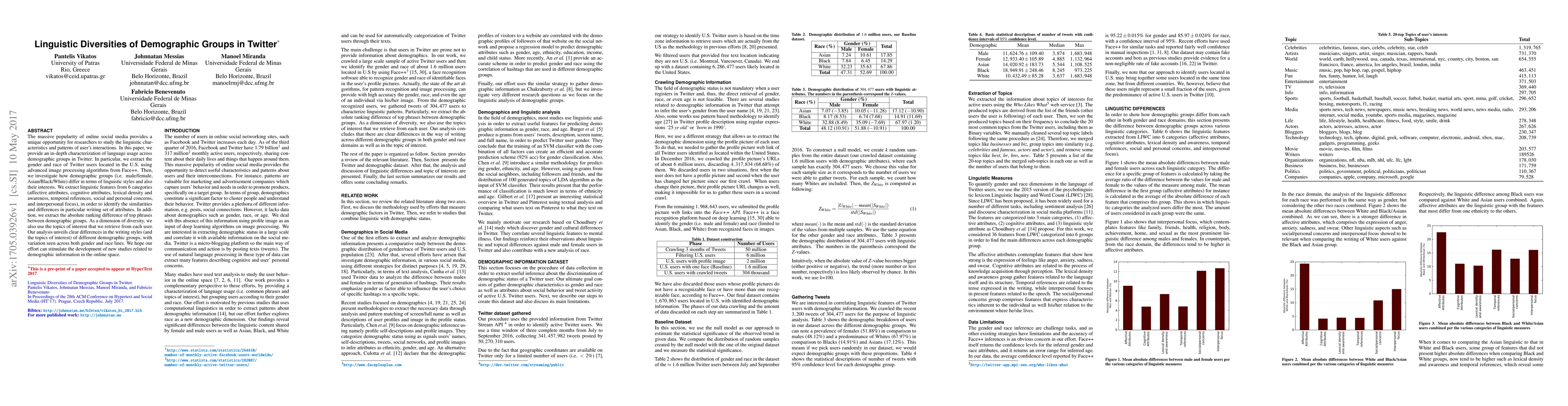 This study investigates linguistic differences across demographic groups on Twitter, revealing distinct writing styles and topics of interest for males, females, Asians, Blacks, and Whites. The analysis provides new insights into the role of demographics in shaping online communication patterns.