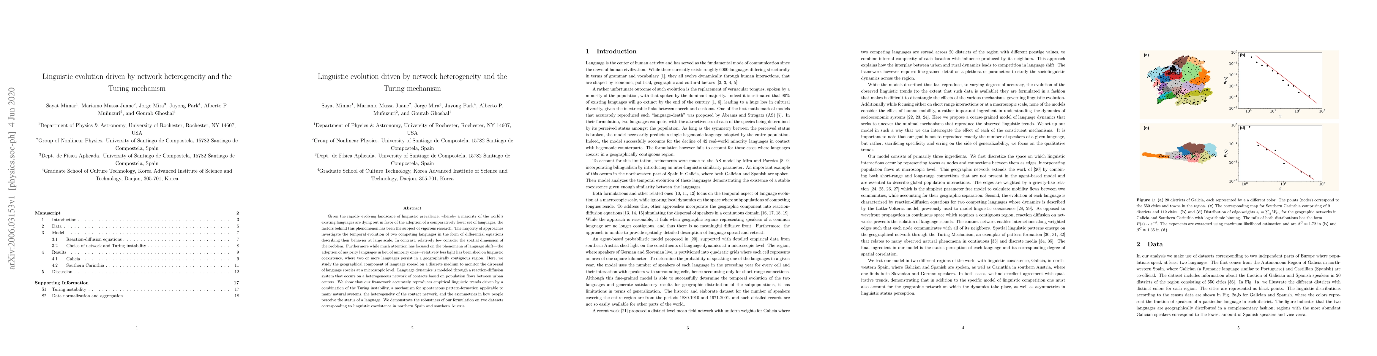 Given the rapidly evolving landscape of linguistic prevalence, whereby a majority of the world's existing languages are dying out in favor of the adoption of a comparatively fewer set of languages, the factors behind this phenomenon has been the subject of vigorous research. The majority of approaches investigate the temporal evolution of two competing languages in the form of differential equations describing their behavior at large scale. In contrast, relatively few consider the spatial dimension of the problem. Furthermore while much attention has focused on the phenomena of language shift---the adoption of majority languages in lieu of minority ones---relatively less light has been shed on linguistic coexistence, where two or more languages persist in a geographically contiguous region. Here, we study the geographical component of language spread on a discrete medium to monitor the dispersal of language species at a microscopic level. Language dynamics is modeled through a reaction-diffusion system that occurs on a heterogeneous network of contacts based on population flows between urban centers. We show that our framework accurately reproduces empirical linguistic trends driven by a combination of the Turing instability, a mechanism for spontaneous pattern-formation applicable to many natural systems, the heterogeneity of the contact network, and the asymmetries in how people perceive the status of a language. We demonstrate the robustness of our formulation on two datasets corresponding to linguistic coexistence in northern Spain and southern Austria.
