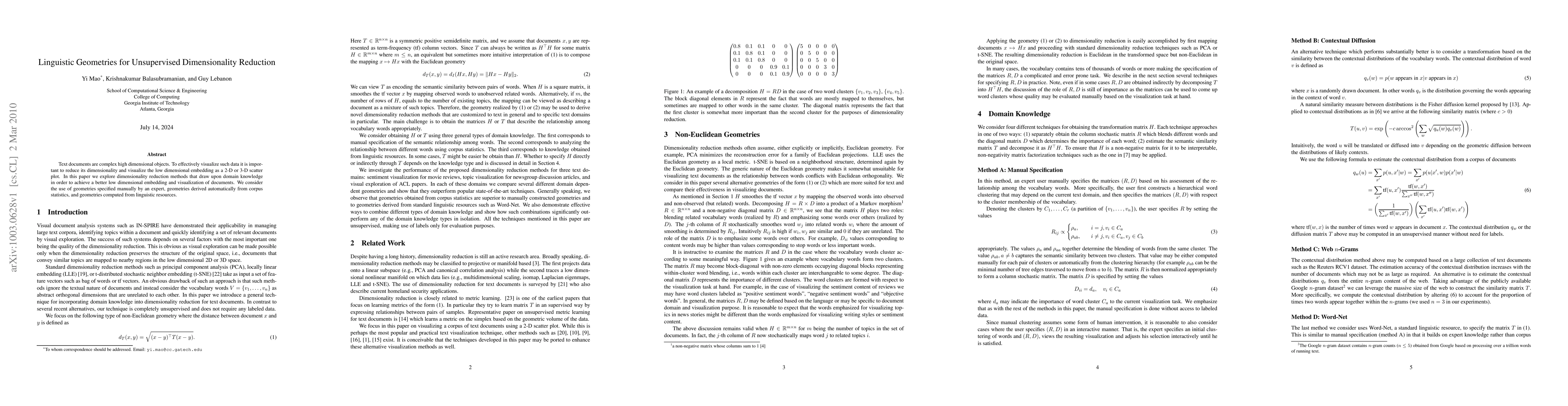 Researchers developed linguistic geometries to improve unsupervised dimensionality reduction of text documents for better visualization in low-dimensional spaces. Their approach combines expert-defined geometries with automatically derived statistics from corpus data.