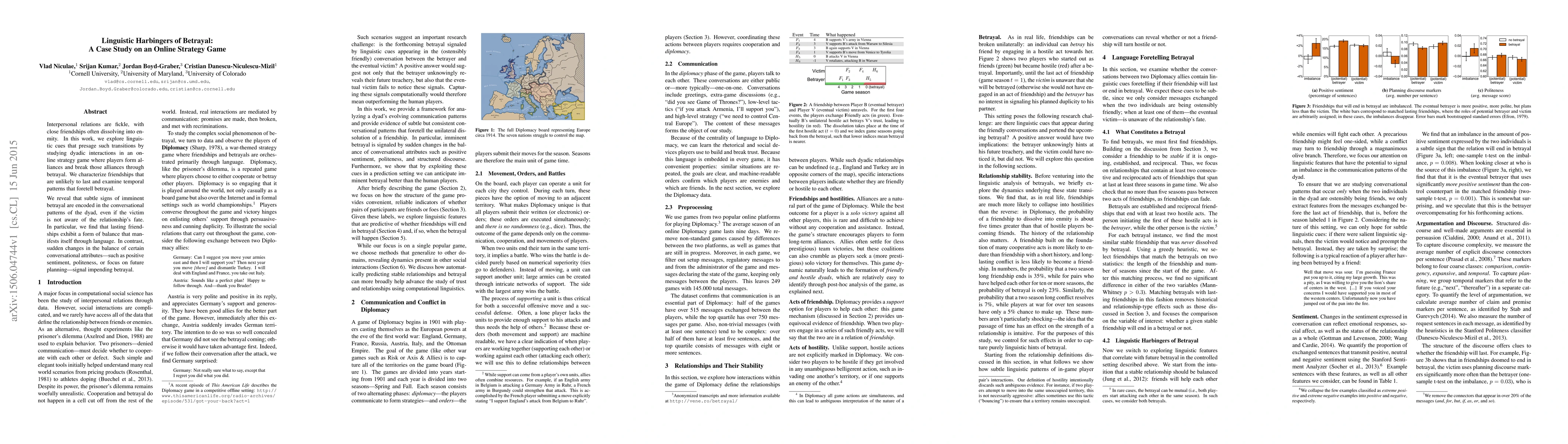 Interpersonal relations are fickle, with close friendships often dissolving into enmity. In this work, we explore linguistic cues that presage such transitions by studying dyadic interactions in an online strategy game where players form alliances and break those alliances through betrayal. We characterize friendships that are unlikely to last and examine temporal patterns that foretell betrayal. We reveal that subtle signs of imminent betrayal are encoded in the conversational patterns of the dyad, even if the victim is not aware of the relationship's fate. In particular, we find that lasting friendships exhibit a form of balance that manifests itself through language. In contrast, sudden changes in the balance of certain conversational attributes---such as positive sentiment, politeness, or focus on future planning---signal impending betrayal.